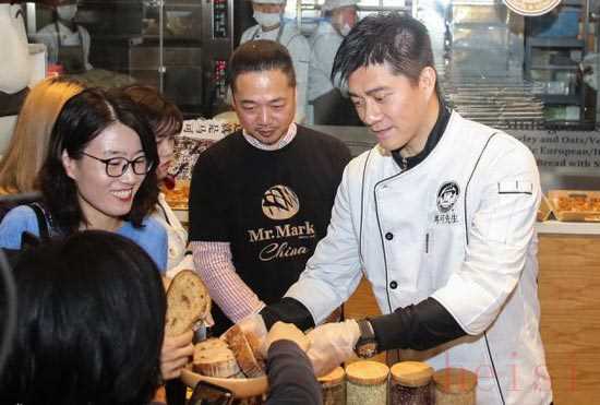 (羽毛球奧運(yùn)冠軍傅海峰將自己制作的面包分享給顧客品嘗)