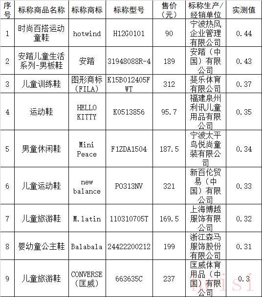 在防滑性能方面,39件(剔除不符合強標要求的)樣品中,有9件樣品摩擦系數(shù)甚至好于雪地靴推薦標準(≥0.3)的要求,包括hotmind、安踏、FILA、new balance、M.latin、Balabala(巴拉巴拉)、CONVERSE(匡威)等品牌童鞋樣品。