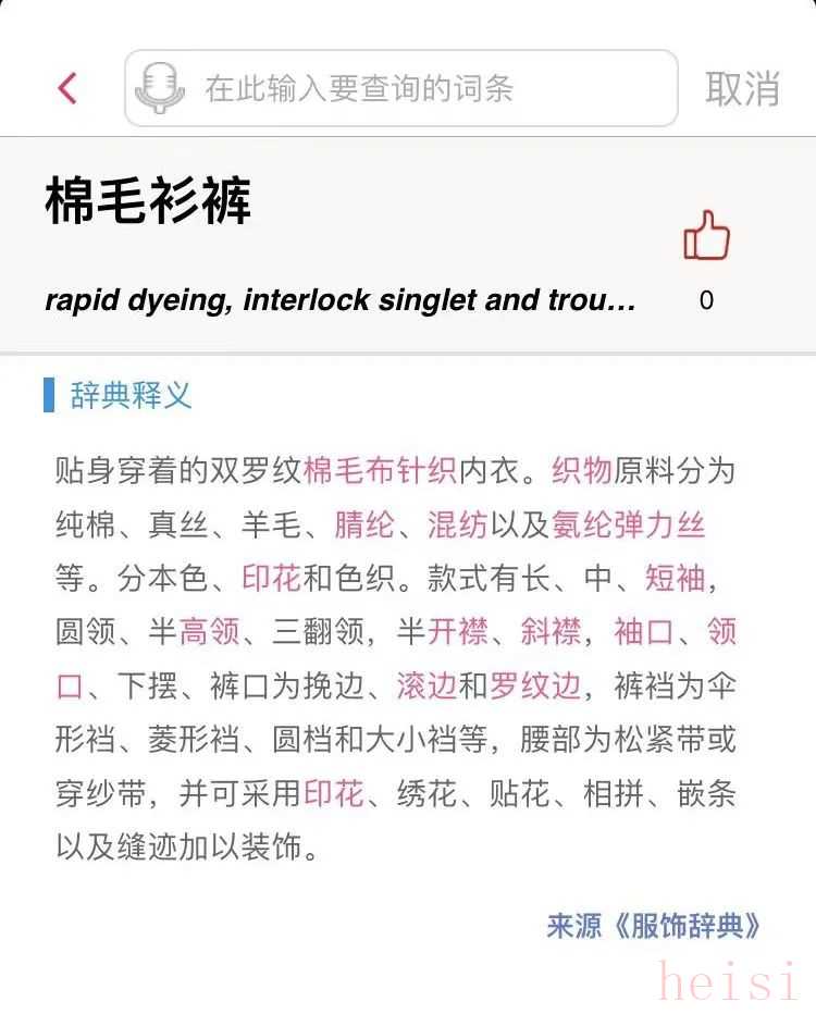 《服飾辭典》對棉毛衫褲的定義是“貼身穿著的雙羅紋棉毛布針織內(nèi)衣??椢镌戏譃榧兠?、真絲、羊毛、腈綸、混紡以及氨綸彈力絲等?!?/strong>(張渭源,王傳銘主編:《服飾辭典》,中國紡織出版社)