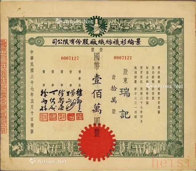 1948年,景綸衫襪紡織廠的股票