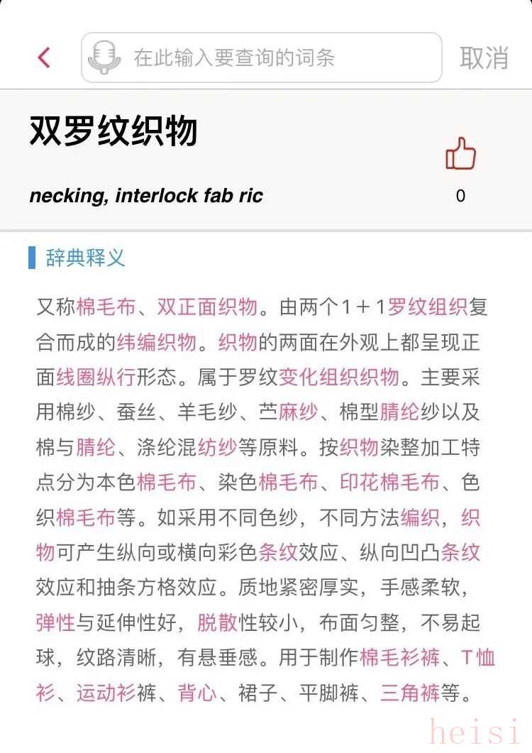 圖片來源:《紡織辭典》 這種針織物質(zhì)地緊密厚實(shí),手感柔軟,彈性強(qiáng),延伸性好,不易脫散,布面勻整,特別適合于制作保暖內(nèi)衣。由于棉和毛是雙羅紋織物最主要的原料,因此,“雙羅紋組織”又被稱為“棉毛組織”,其編織機(jī)械叫做“棉毛機(jī)”,而“棉毛布”自然也就成了“雙羅紋織物”的通俗名稱。