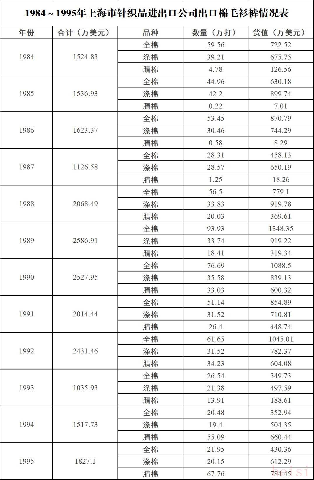 1984~1995年上海市針織品進(jìn)出口公司出口棉毛衫褲情況表