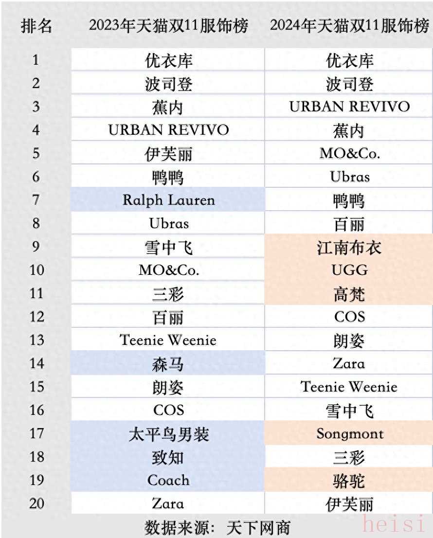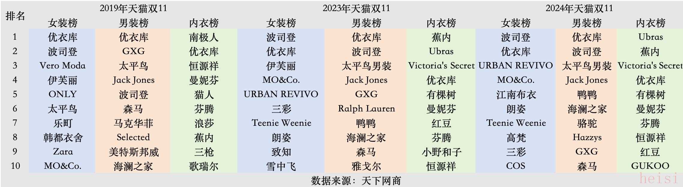 如果進(jìn)一步聚焦男、女裝及內(nèi)衣榜單,并將對(duì)比跨度拉得更長(zhǎng),則能看到更多細(xì)分趨勢(shì)。