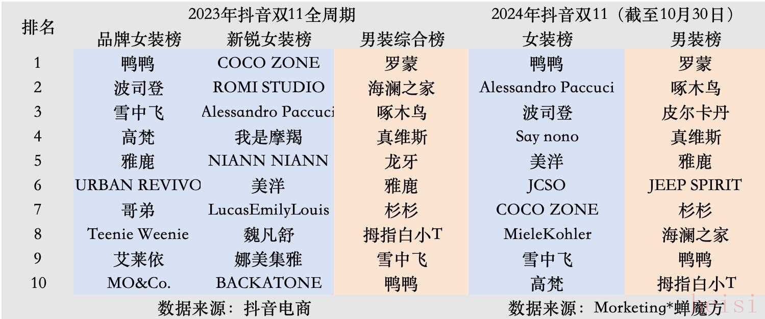 女裝方面,“抖品牌”尤其是紅人品牌在抖音的影響力不容小覷,例如連續(xù)兩年在榜單前列的Alessandro Paccuci、COCO ZONE、美洋等,這些品牌多定位在比快時(shí)尚略高一檔的中端價(jià)位。另外,鴨鴨、波司登、雪中飛、高梵、雅鹿等羽絨服品牌通常是抖音電商雙11的主角。