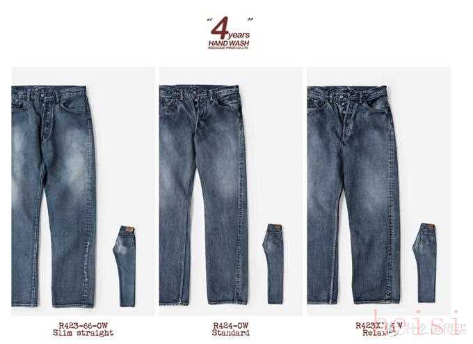 別以為只有國外品牌做牛仔褲厲害,其實(shí)也有一些國內(nèi)的小眾牛仔品牌的做的不錯(cuò)的,來自沈陽Red Cloud的牛仔褲使用高級的新疆長絨棉來制作牛仔布,柔軟舒適,這就打破了大家對于牛仔褲“硬”的認(rèn)知,也是我之前說過影響一條牛仔褲舒適性的關(guān)鍵。從最初的原色牛仔,到現(xiàn)在開始使用水洗工藝,并且對水洗工藝進(jìn)行了改進(jìn),為了保證面料紗線的牢固度舍棄了傳統(tǒng)的磨砂工藝,直接采用褪色劑,并且全部是手工水洗,每條褲子要經(jīng)過4-5次的顏色校準(zhǔn)。缺點(diǎn)就是款式比較少,只有少數(shù)幾款經(jīng)典款。▼4年水洗系列,也是該品牌的最高端系列。三個(gè)版型:R423-代表修身,R424-代表標(biāo)準(zhǔn)版,R423XX-代表寬松版面料柔軟,風(fēng)格簡潔,做工精細(xì),價(jià)格較貴