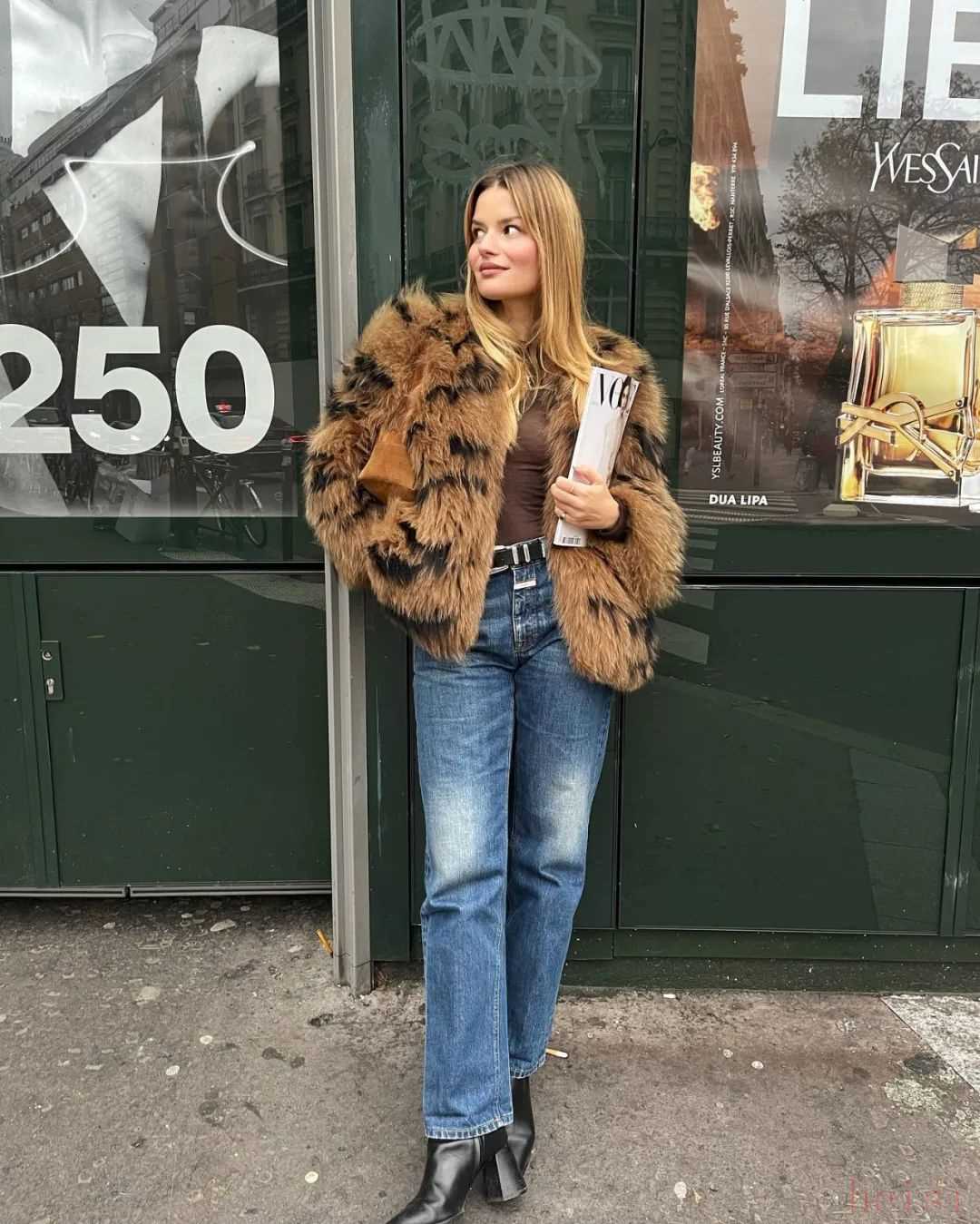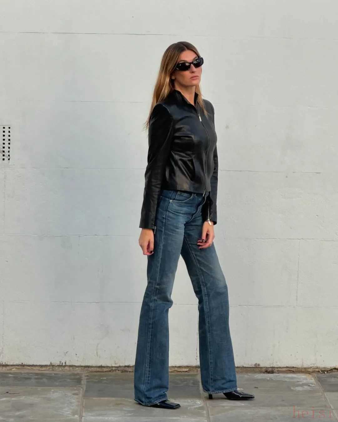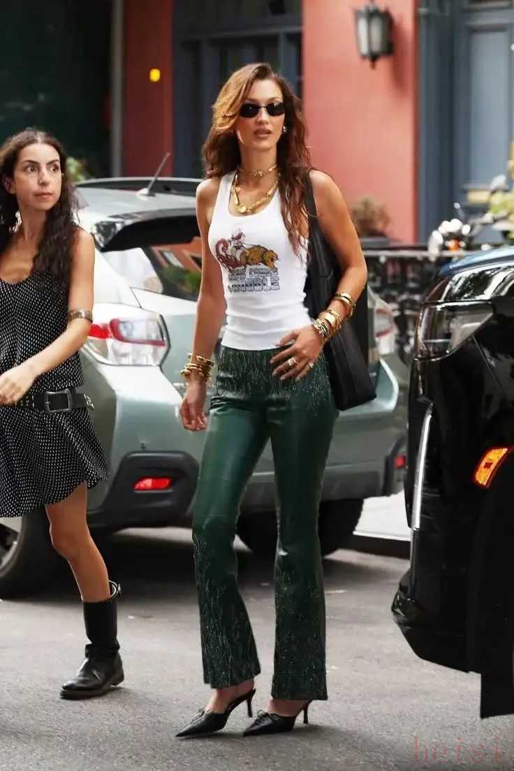 復古緊身上衣+微喇牛仔褲+尖頭高跟靴,這套穿搭公式仿佛成了她的出街標配。