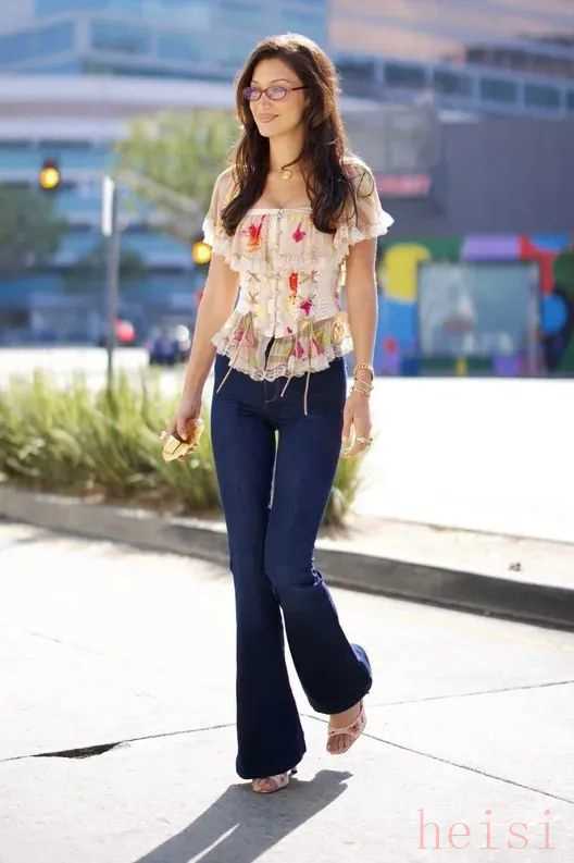 一是既能顯腿長,又能修飾腿型。喇叭褲的褲型,一般從臀部到大腿的位置非常的合體,直至小腿處才開始慢慢松開。這樣特殊的廓形像拍照時的交叉腳一樣,視覺上能起到顯腿長的效果,堪稱“拉腿神器”。