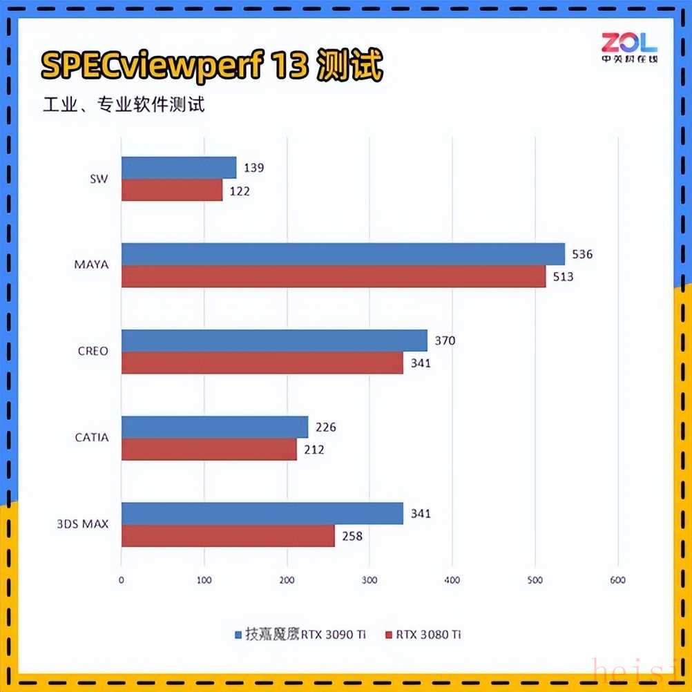 上圖為筆者使用SPECviewperf 13這款工業(yè)、專業(yè)軟件跑分測試。對比顯卡為本代的游戲旗艦RTX 3080 Ti和生產(chǎn)力工具旗艦RTX 3090 Ti。
