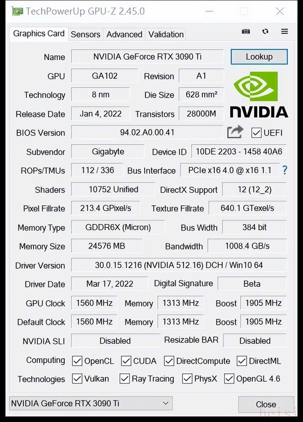 首先看一下GPU-Z的參數(shù),技嘉RTX 3090 Ti 魔鷹24G采用GA102核心,三星8nm工藝,芯片面積628平方毫米,擁有10752個(gè)CUDA,Boost頻率達(dá)到1905MHz,相較公版的1860MHz有較大提升。采用12GB GDDR6X顯存,位寬為384bit,顯存帶寬達(dá)到了1008.4 GB/s,光柵單元和紋理單元為112和336。