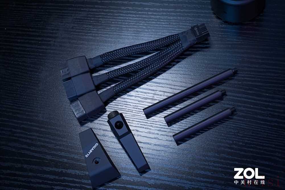 首先開箱,在配件方面,除了常見的金屬顯卡支架外,由于本次在非公版顯卡中首次搭載了單16pin供電接口,所以還配備了一根單12pin轉(zhuǎn)8pin*3的轉(zhuǎn)接線,不過兩頭都接上后,這一段會“支棱”著,裝在機(jī)箱里還是比較明顯的。