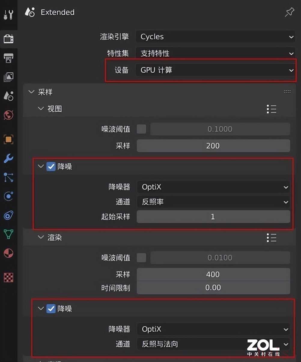 在軟件內(nèi)的渲染設(shè)置內(nèi),勾選兩項(xiàng)降噪,并且為了增加渲染時(shí)常,我們將采樣率提升至400,渲染分辨率提升為200%。