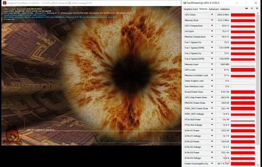 功耗測試中,我們選擇FurMark軟件進(jìn)行拷機(jī)測試,并采用GPU-Z檢測溫度,功耗僅計(jì)算顯卡自身。