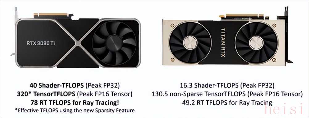 相較于上一代Turing RTX架構(gòu)的,NVIDIA Ampere架構(gòu)在算力上有著成倍的增長,GeForce RTX 3090 Ti的著色器性能達(dá)到40 TFLOPS單精度性能,而搭載NVIDIA Turing架構(gòu)的TITAN為16.3 TFLOPS。