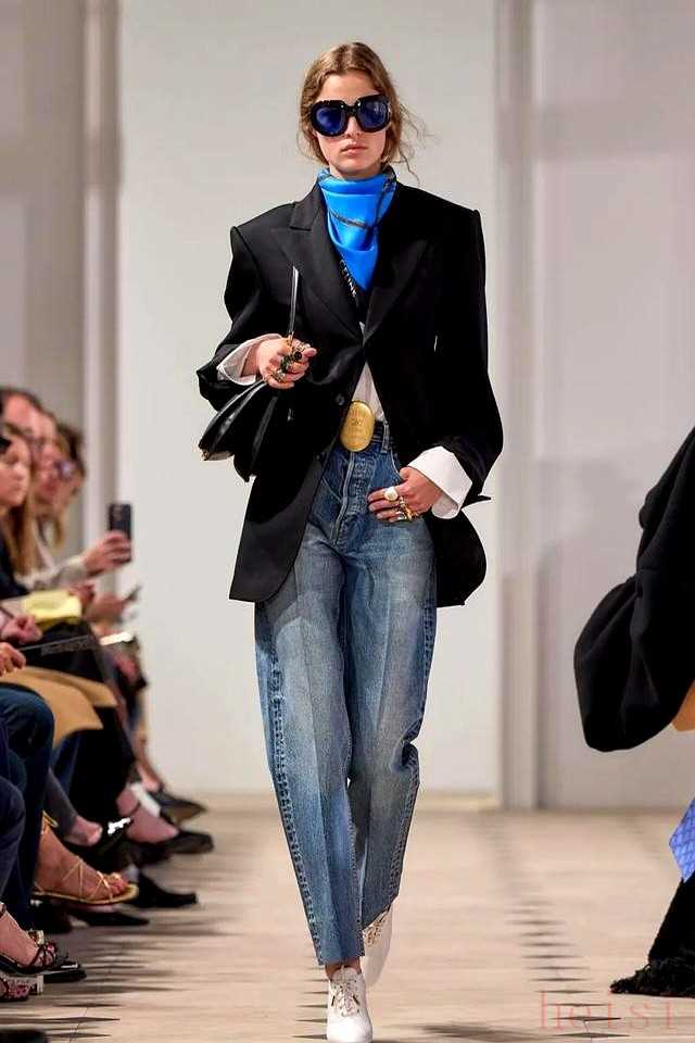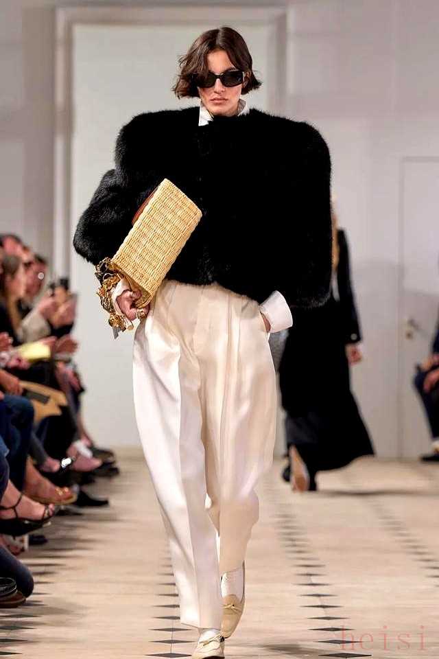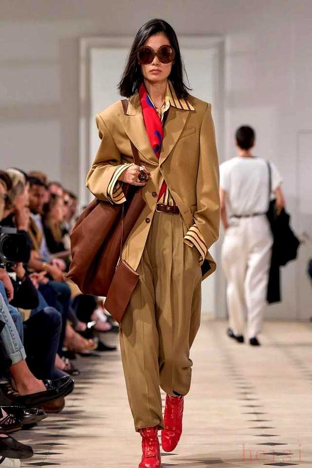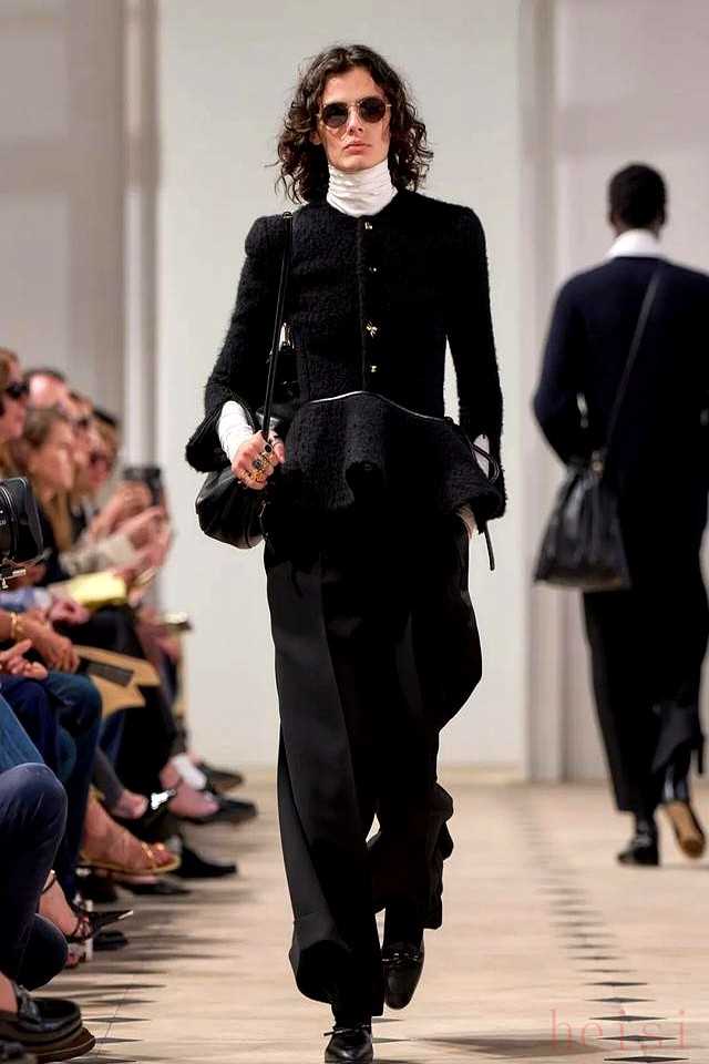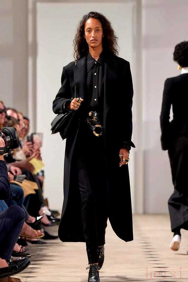 這場雨中的秀不靠夸張設計,絲巾從頸間滑落、纏繞手袋,細節(jié)里藏著Phoebe Philo時代的簡約魂,Hedi Slimane的纖細剪裁也沒缺席。