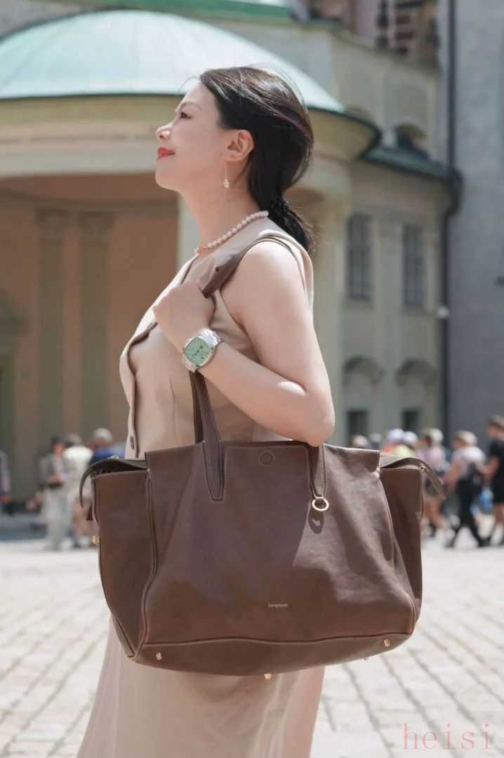 Suzi在展覽上背了中號(hào)的棕色麂皮款旅行袋,隨意放在身上特別隨性~