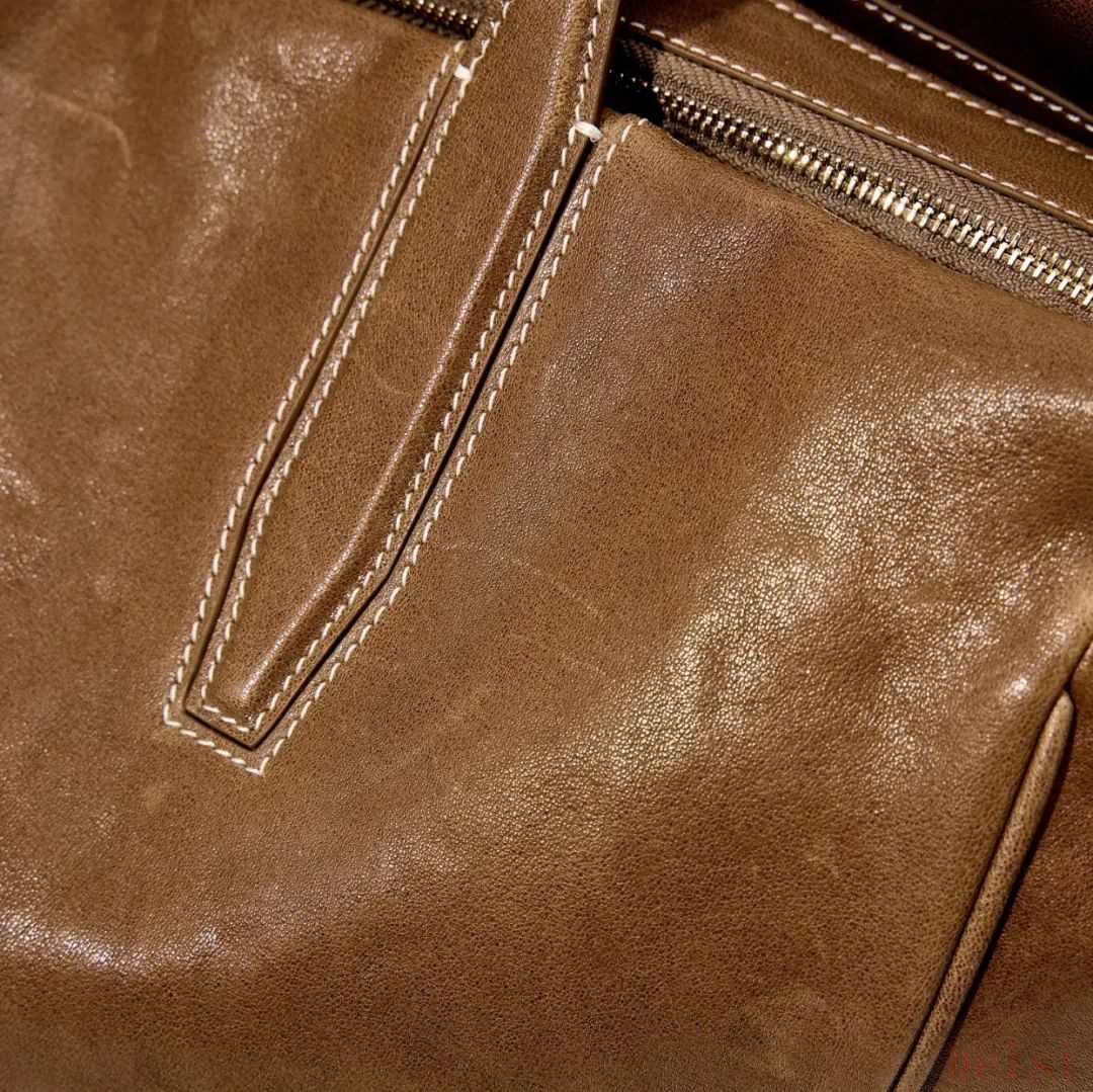 這款“循跡”包包的皮料是我非常喜歡的那種“時(shí)光植鞣皮革”。它非常柔軟耐造,肌理間帶著微微的光澤感,在不同光線和不同角度下,每一寸皮料散發(fā)出的質(zhì)感都不盡相同,令人驚喜。