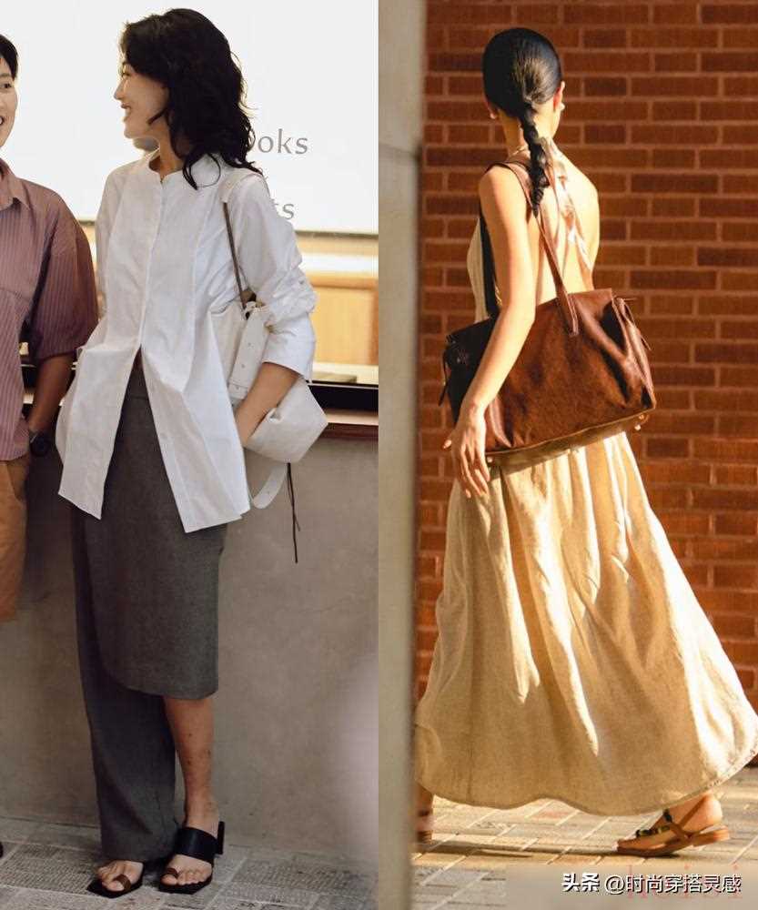 山下有松的包多用真皮,軟塌塌的衣服配它容易顯廉價。夏天選棉麻、真絲、緞面這些垂感好的面料,襯衫要燙得筆挺,裙子別皺巴巴。比如白色真絲襯衫+淺棕“月相”包,面料都帶點“光澤感”,看著就像“花了心思搭的”。