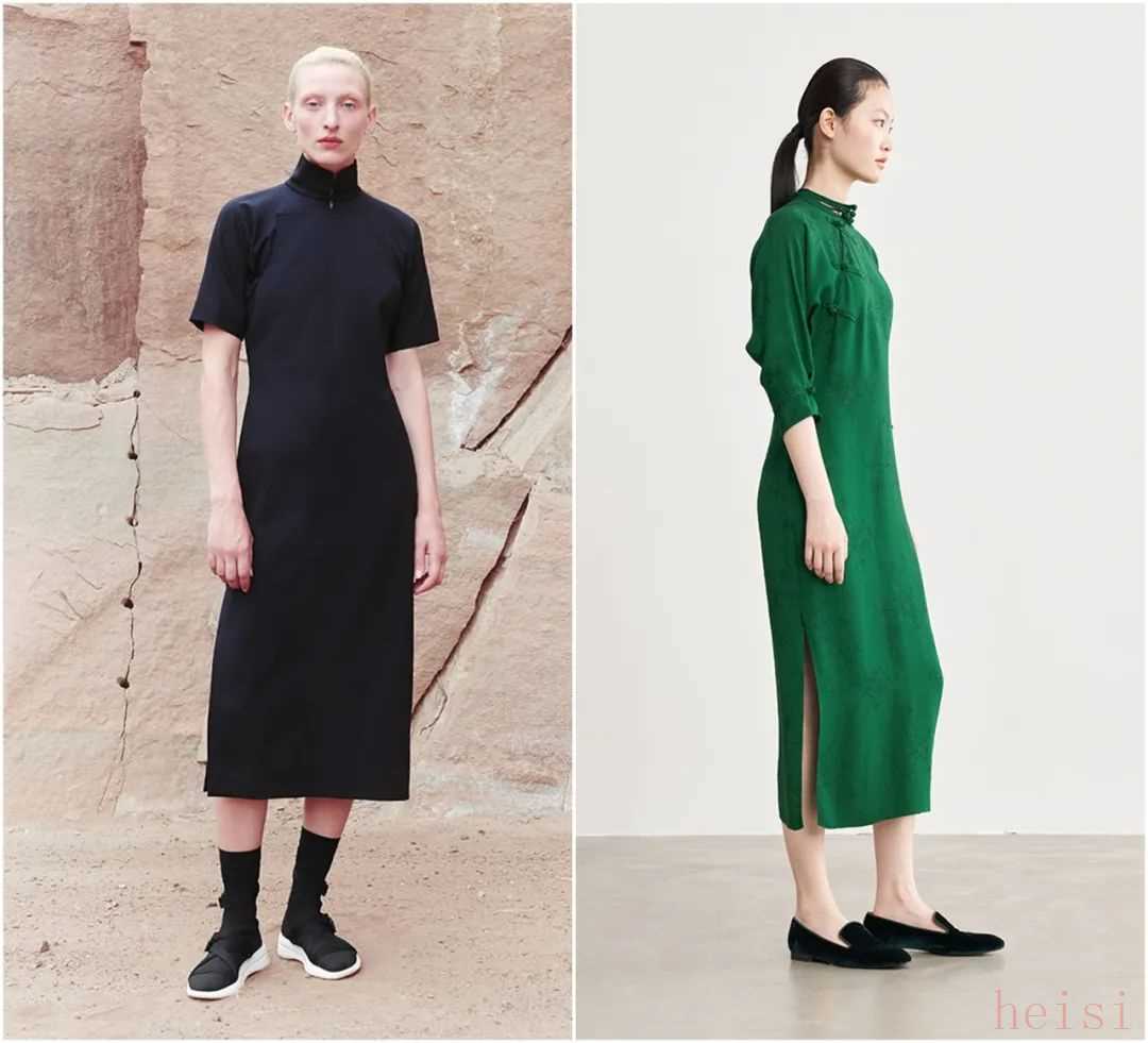 拿旗袍來舉例,它的旗袍會有一定的曲線感,但不會太修身,剪裁也更簡單利落了。對比一下,有沒有覺得還是亞洲模特更能穿出旗袍的美~▼