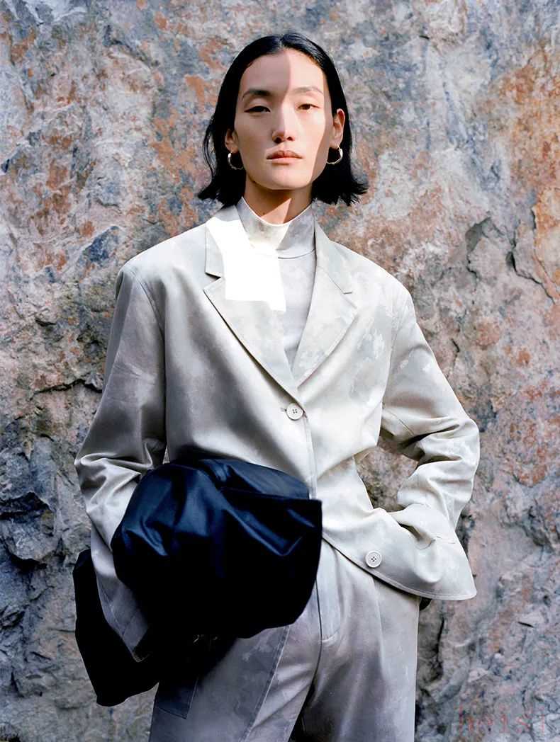 這套西裝就很有風格。遠看好像只是一套平平無奇的灰白色西裝,近看就發(fā)現(xiàn)了一些特別的自然紋理,再仔細一看,圖案和后面當背景墻的巖石紋理如出一轍,有趣~▼