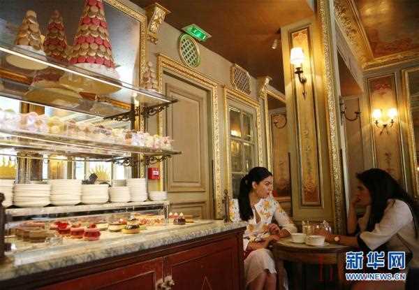 9月3日,在法國巴黎,兩名女子在知名馬卡龍?zhí)鹌返昀侠變冉徽劇P氯A社記者 高靜 攝