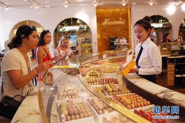 8月30日,在法國巴黎香榭麗舍大街上的知名馬卡龍品牌皮埃爾·埃爾姆門店,顧客選購馬卡龍。新華社記者 高靜 攝