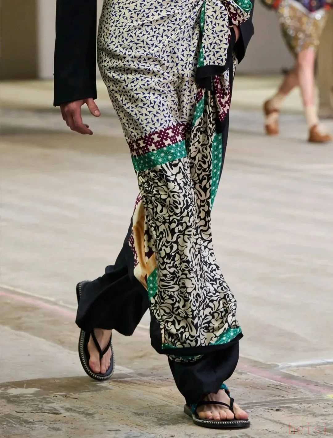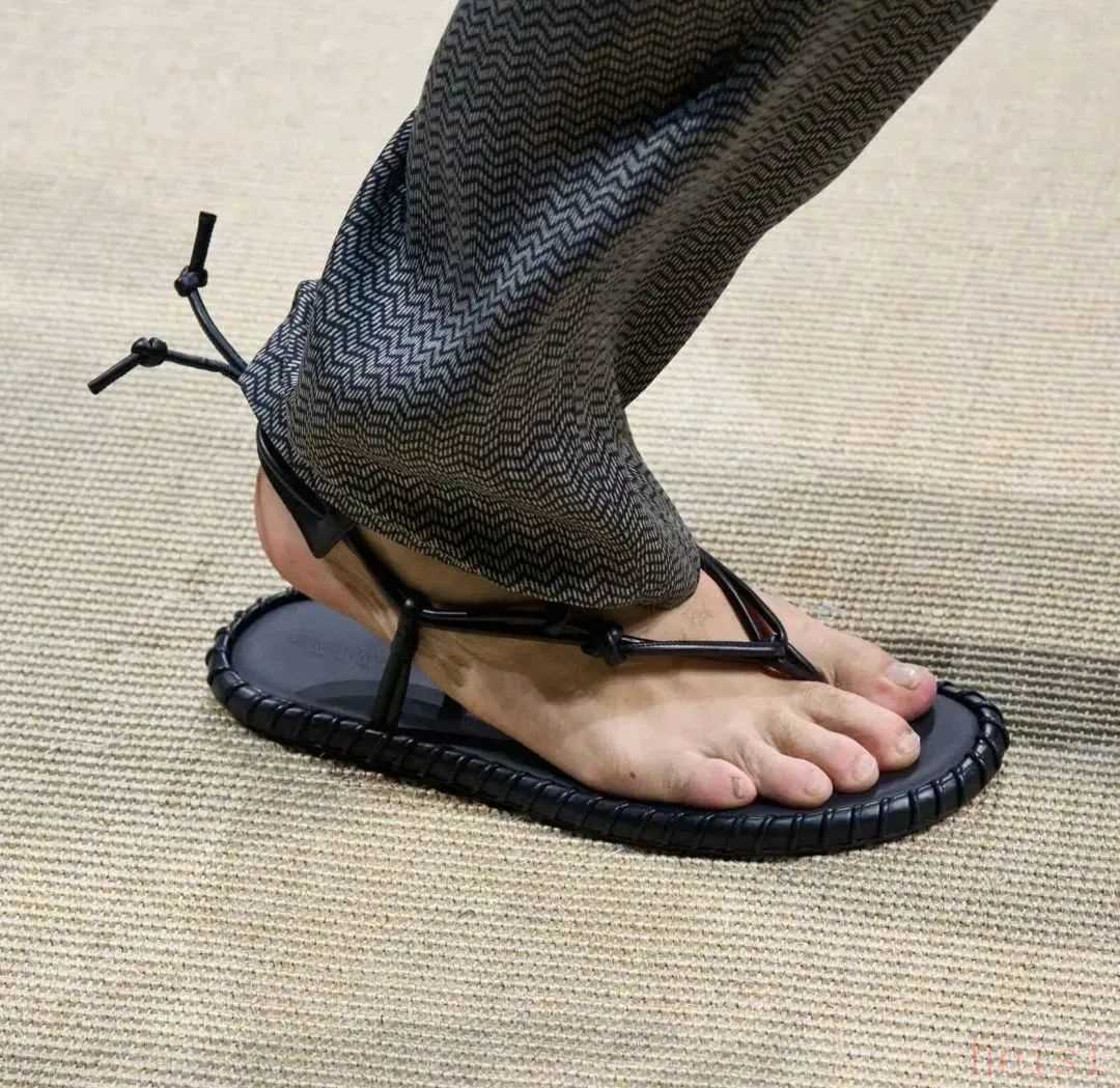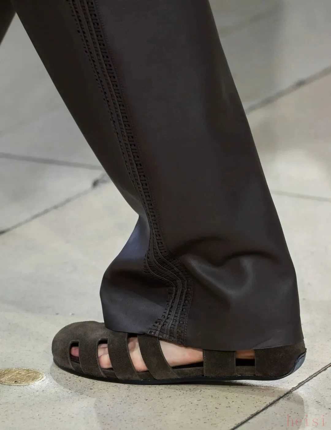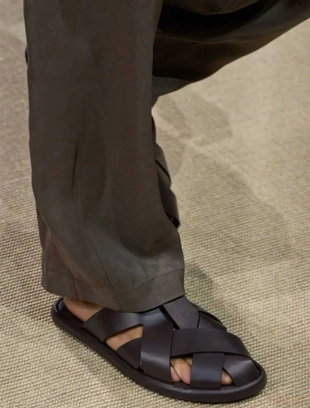 鞋履方面,一款小牛皮與麻繩制成的露趾涼鞋以及一款羅馬鞋貫穿多套造型中,呼應(yīng)夏日著裝需求的同時,也顛覆了皮鞋的“霸權(quán)”。