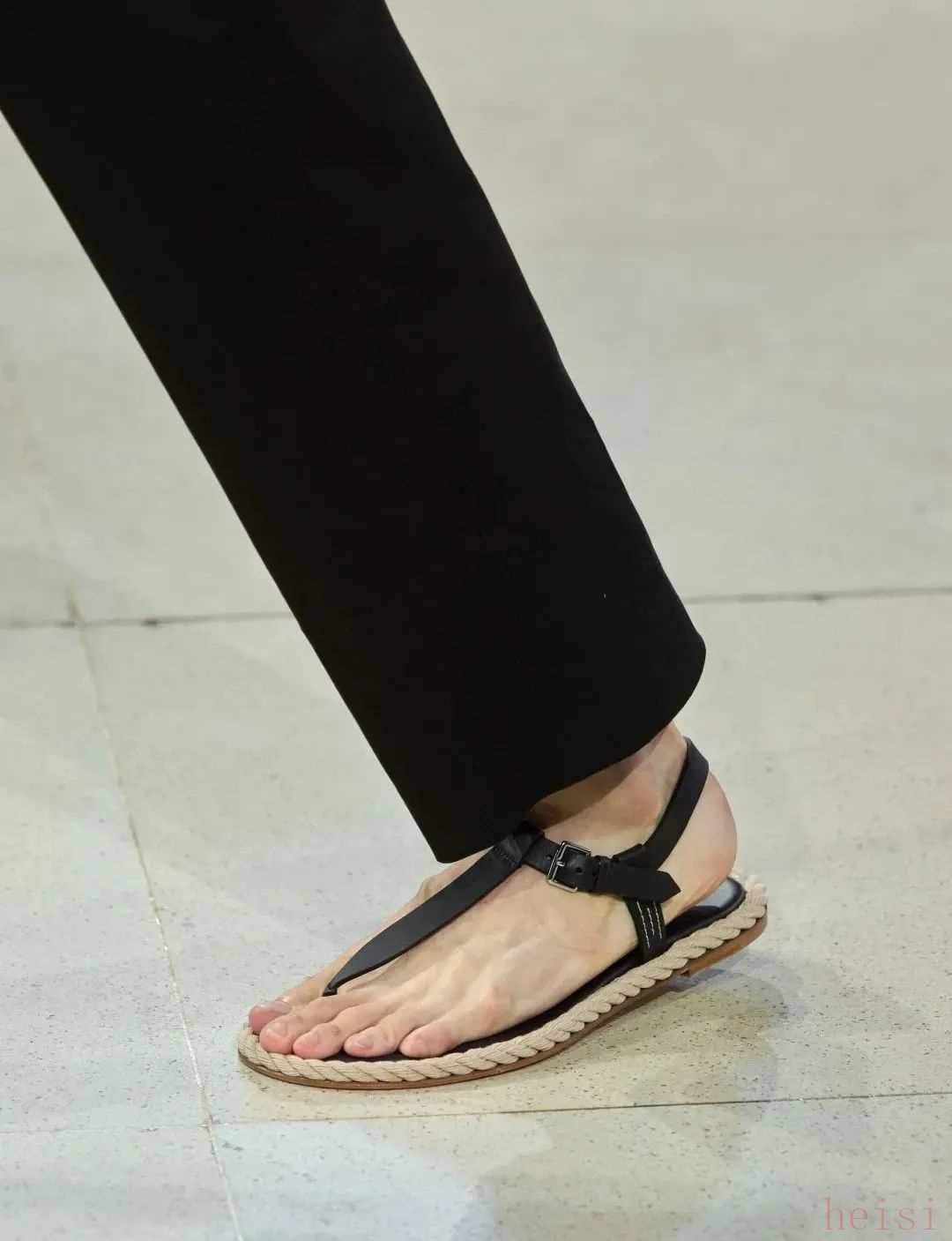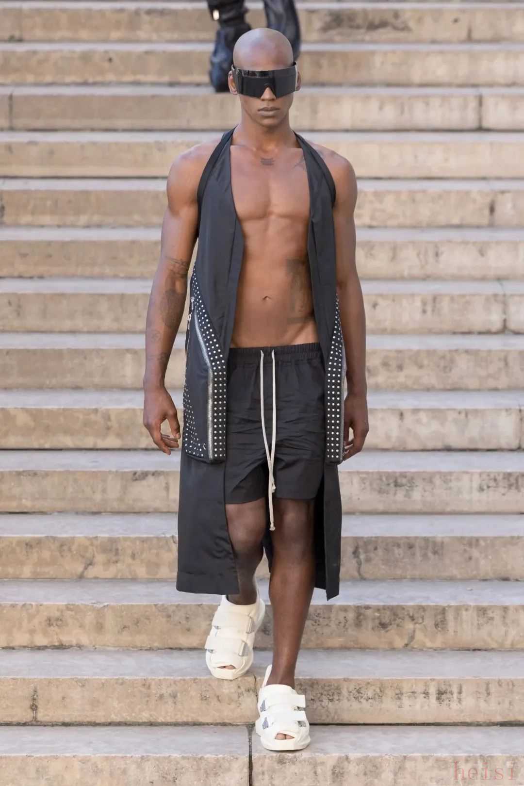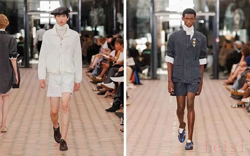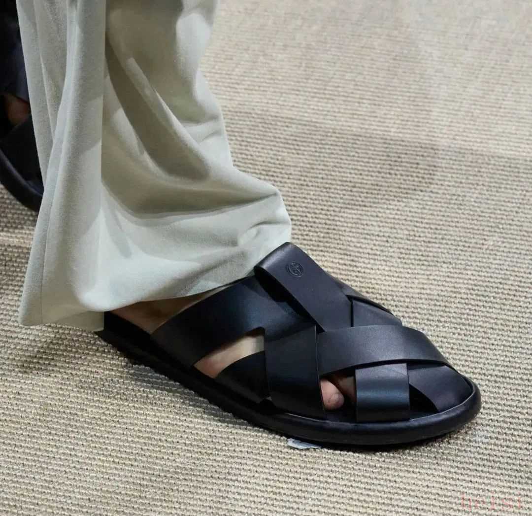 鞋履方面,一款小牛皮與麻繩制成的露趾涼鞋以及一款羅馬鞋貫穿多套造型中,呼應(yīng)夏日著裝需求的同時,也顛覆了皮鞋的“霸權(quán)”。