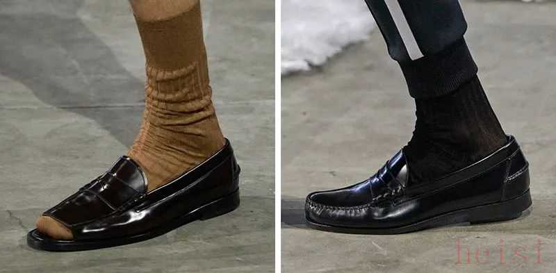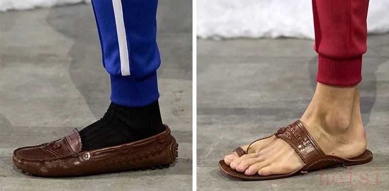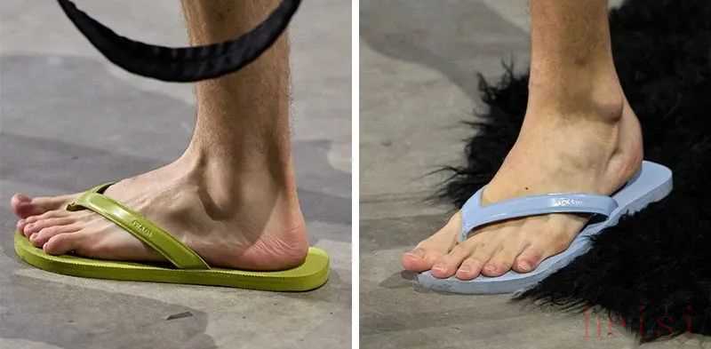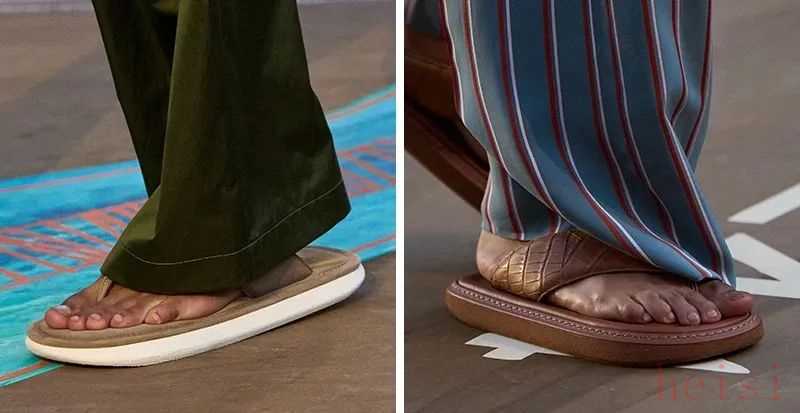 Prada在本季秀場上還是主打薄底鞋,品牌對樂福鞋、系帶皮鞋、船鞋、及踝靴、拖鞋等男士經(jīng)典鞋履都做了超薄底的設(shè)計。