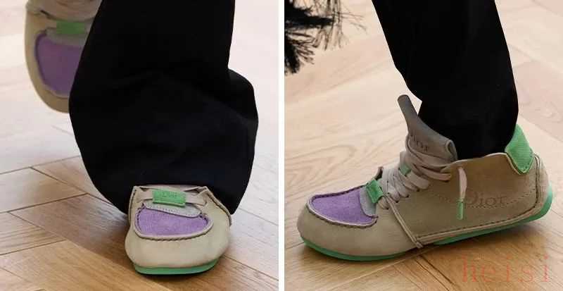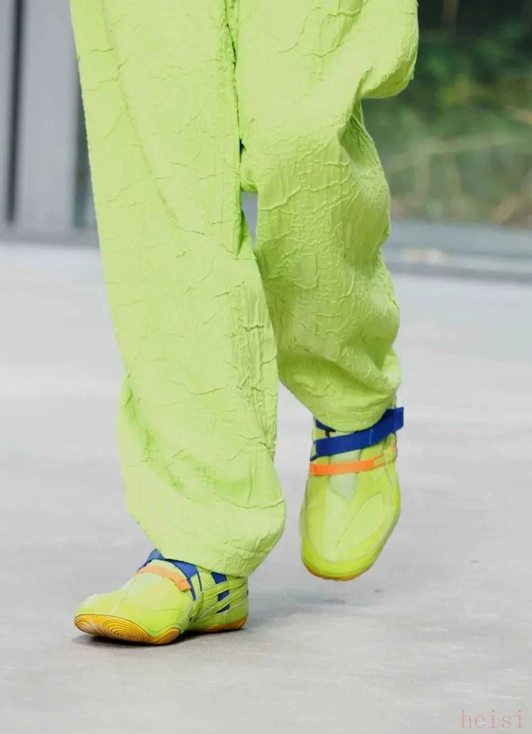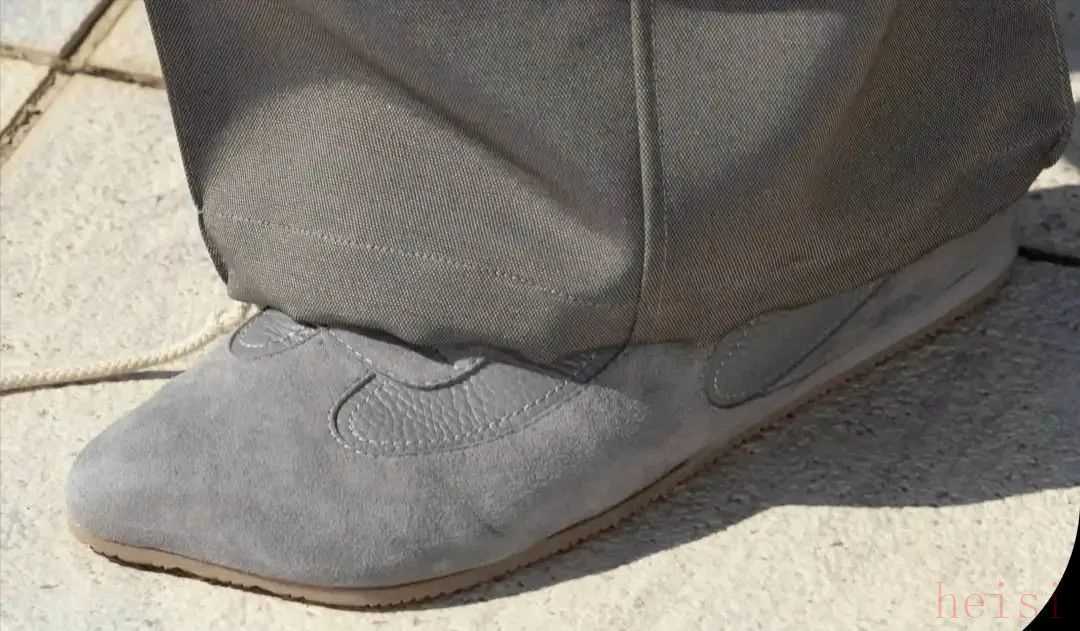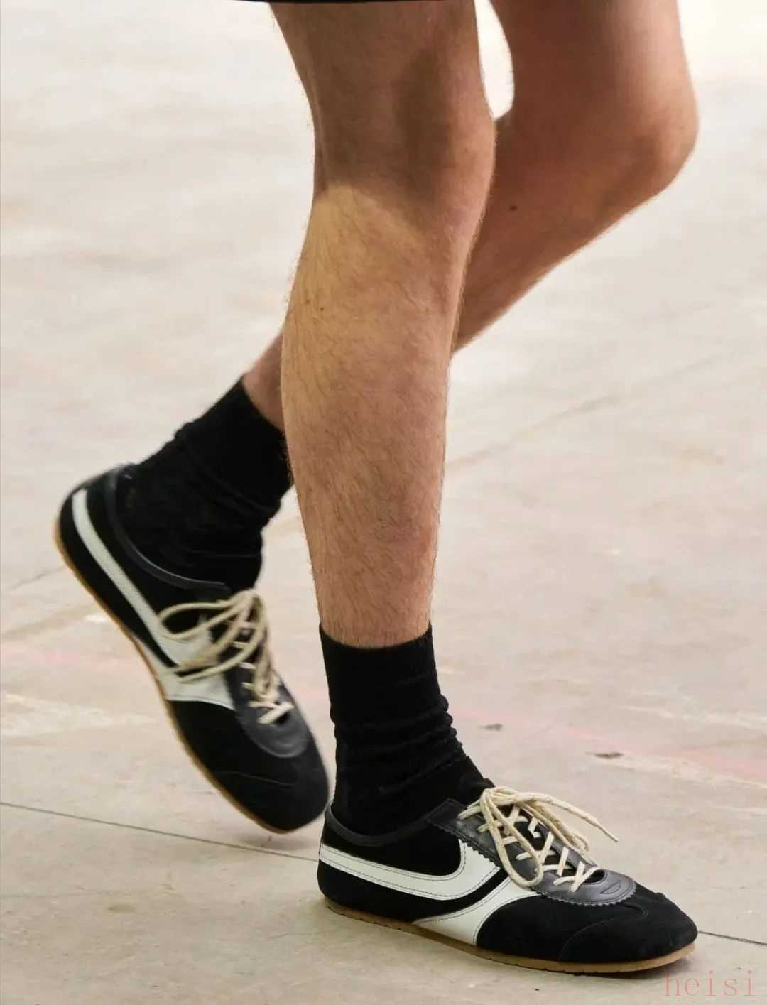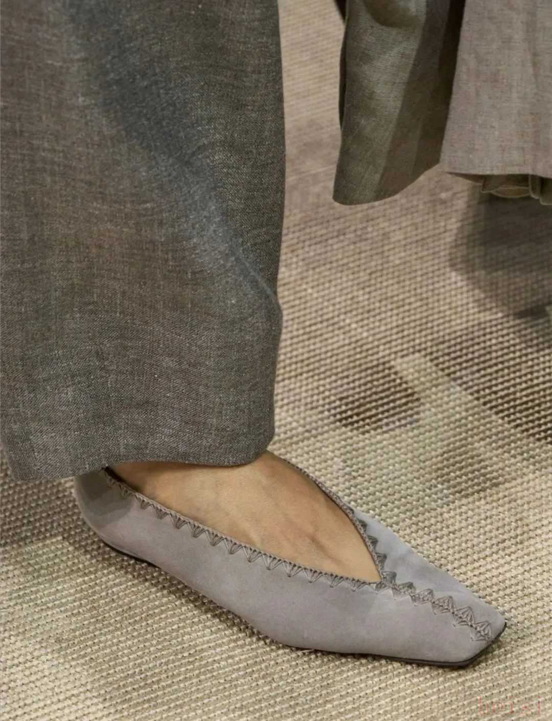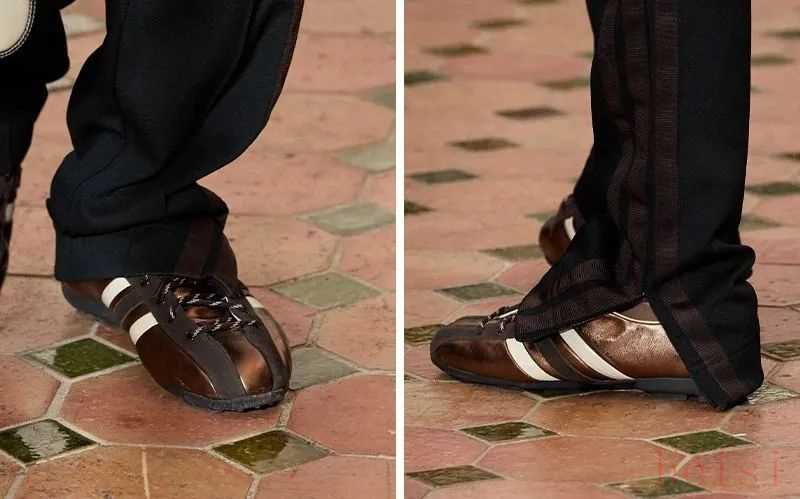復古慢跑鞋融合先鋒輪廓,與麂皮、皮革、帆布等材質(zhì)組合。低飽和色調(diào)如灰、軍綠、冷棕色,貼合整體服裝的“靜默抵抗”情緒。鞋頭設(shè)計打破了傳統(tǒng)的圓/尖對立,以近似“扁方形”呈現(xiàn)一種柔和理性,搭配極薄鞋底與寬筒長褲,凸顯“地面行走的舞者”美感。