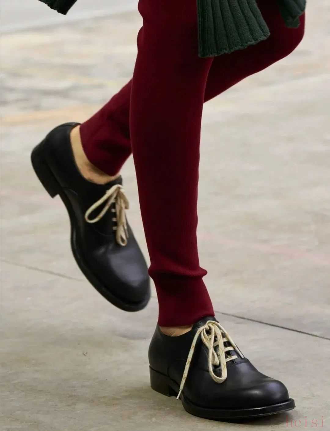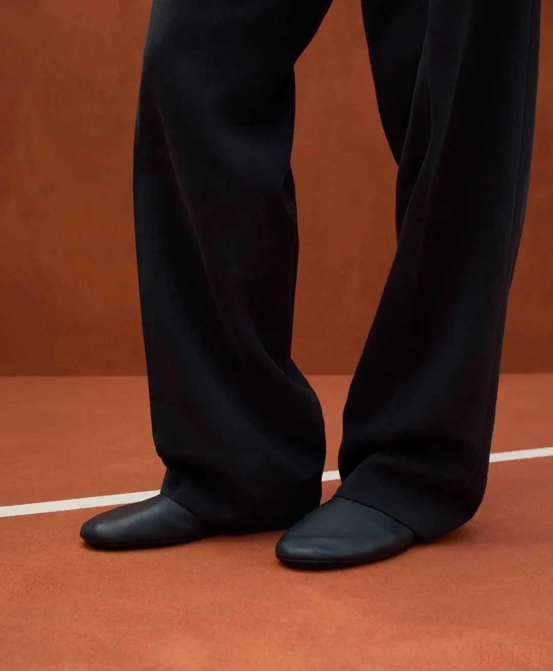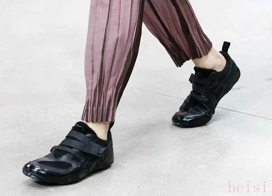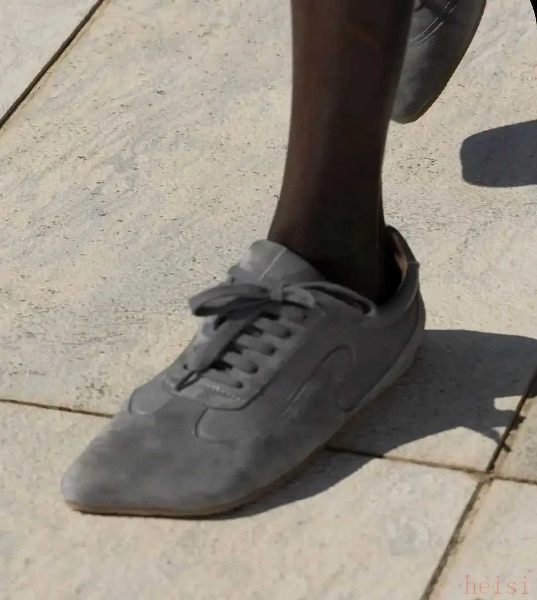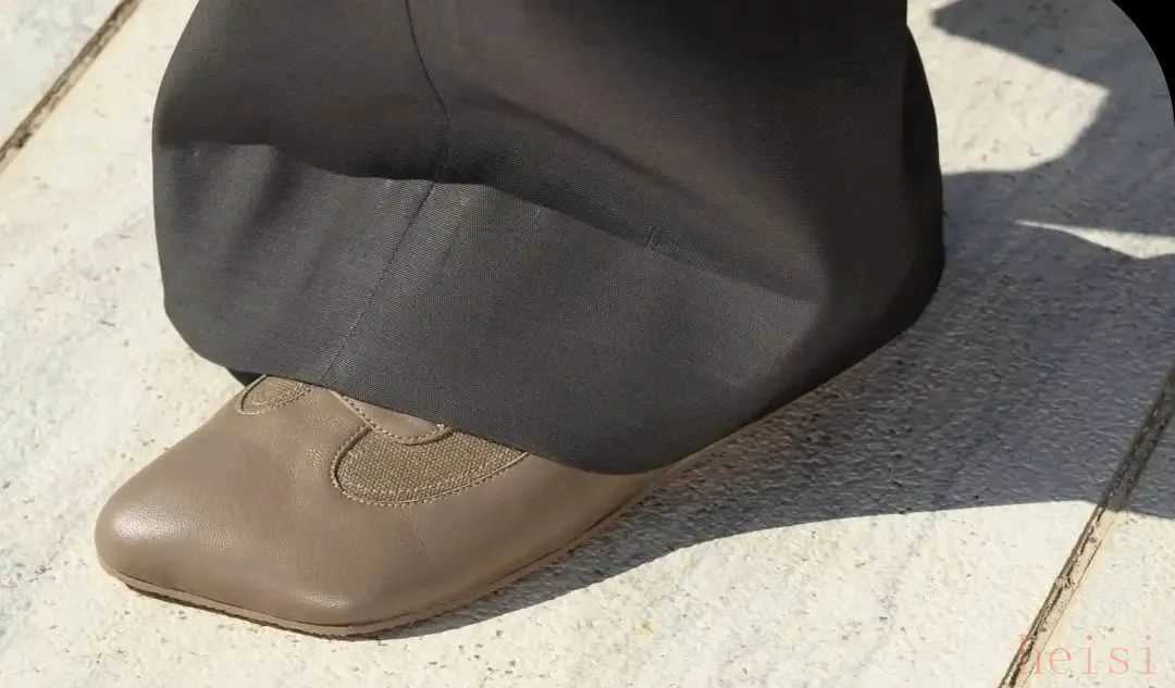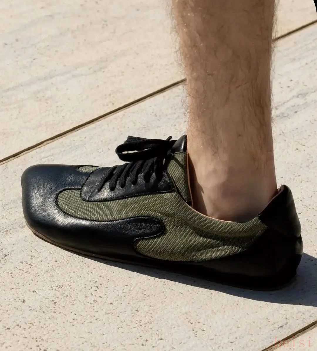 復古慢跑鞋融合先鋒輪廓,與麂皮、皮革、帆布等材質(zhì)組合。低飽和色調(diào)如灰、軍綠、冷棕色,貼合整體服裝的“靜默抵抗”情緒。鞋頭設(shè)計打破了傳統(tǒng)的圓/尖對立,以近似“扁方形”呈現(xiàn)一種柔和理性,搭配極薄鞋底與寬筒長褲,凸顯“地面行走的舞者”美感。