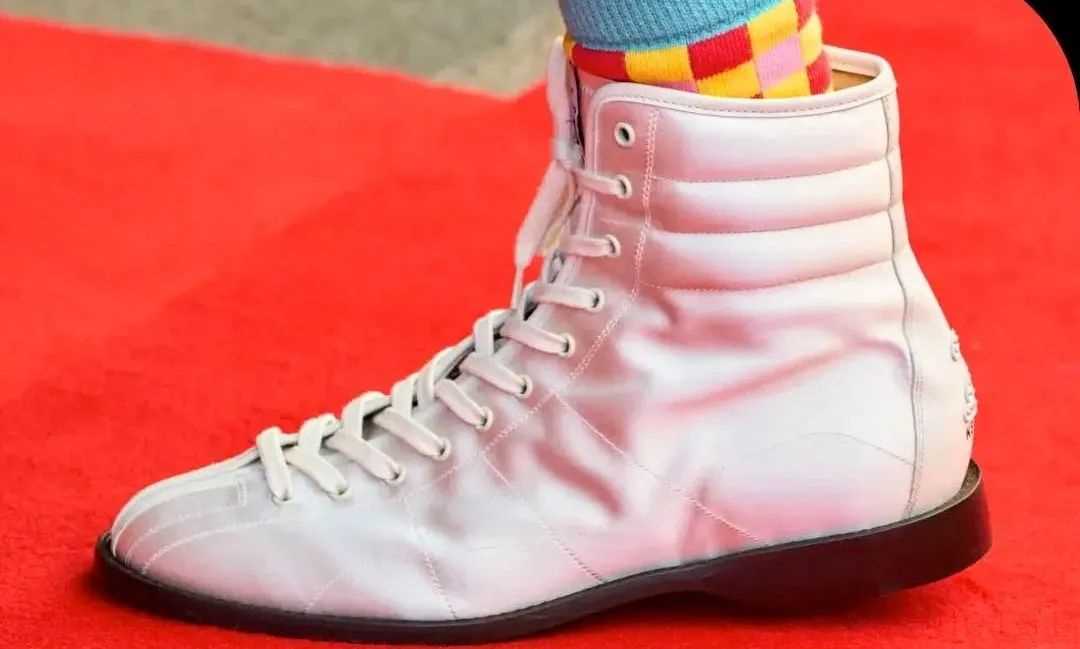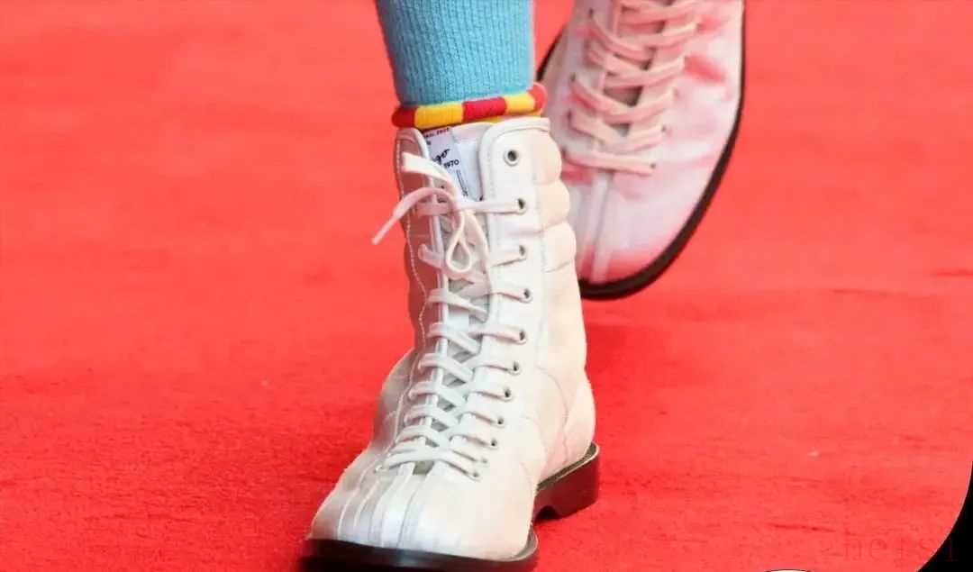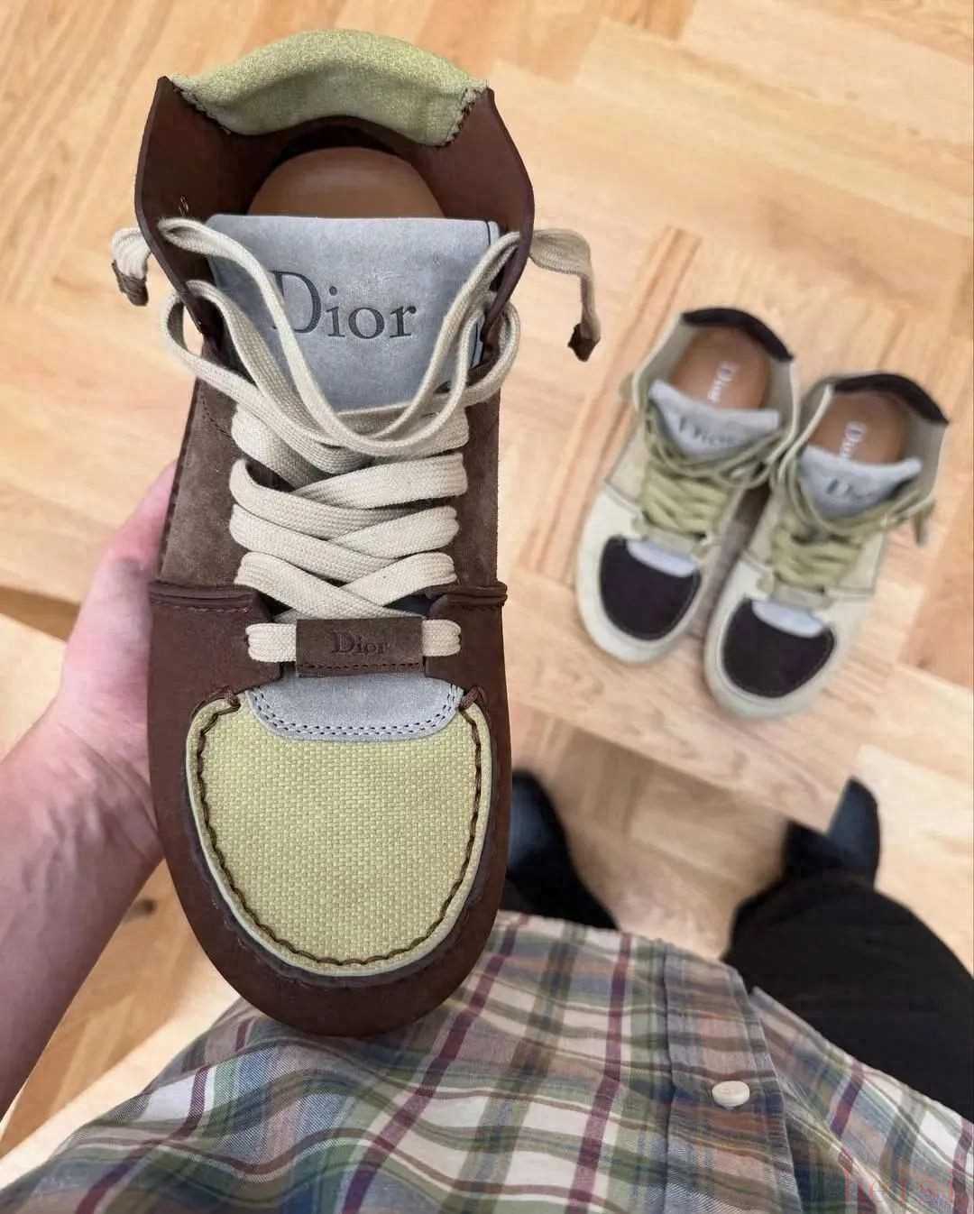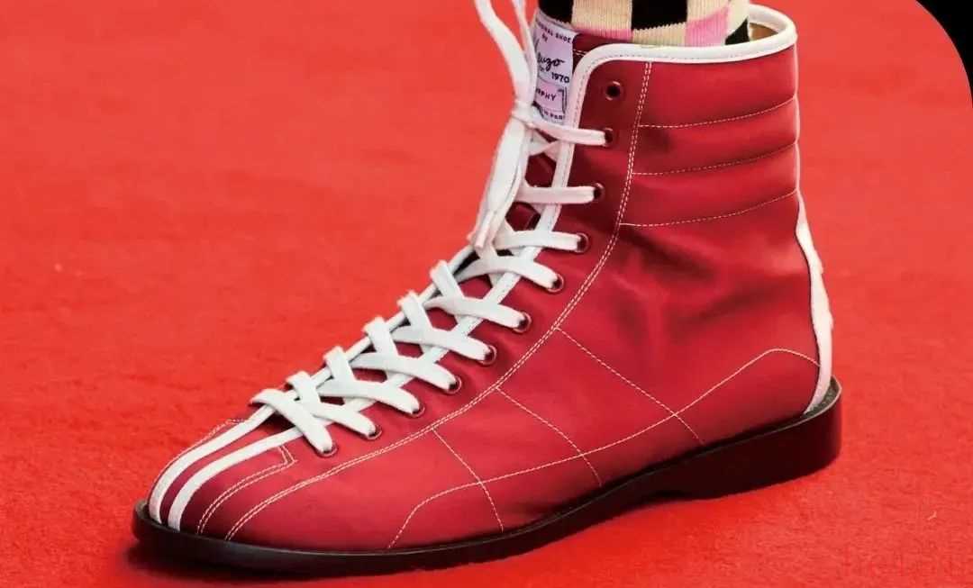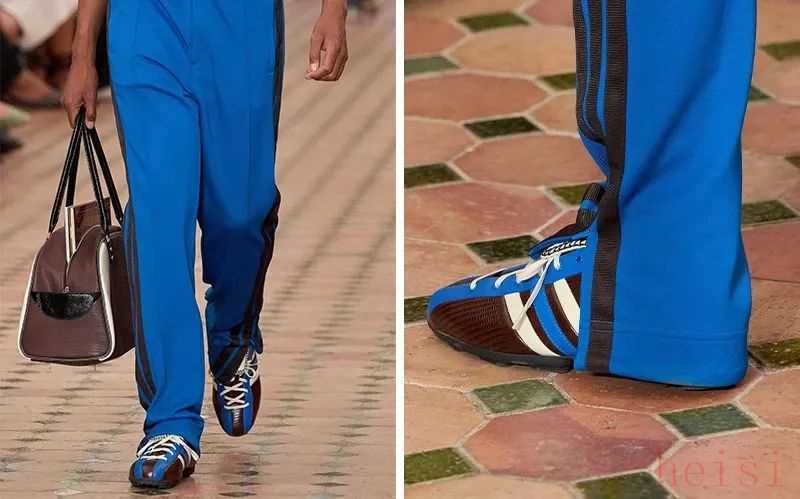 鞋履方面,Jonathan Anderson本季打造了一款頗似傳統(tǒng)運動鞋的混合鞋款,鞋身以經(jīng)典袋鼠鞋的絨面材質(zhì)、方形鞋身為基礎(chǔ),加入了復古高幫球鞋的長鞋舌設(shè)計,整體呈現(xiàn)出一種復古又丑萌的視覺,極具其Loewe時期的混搭日常感美學,成為Dior本季最具話題性的鞋款。