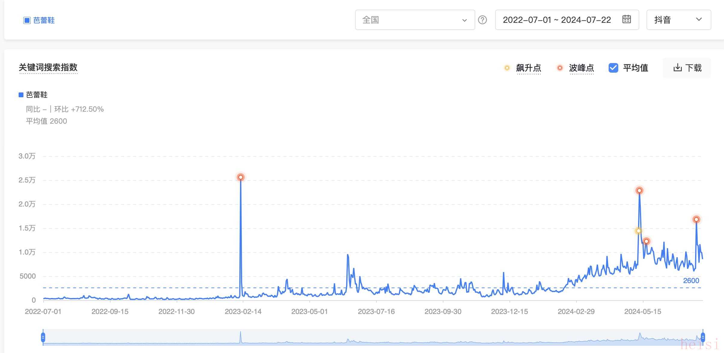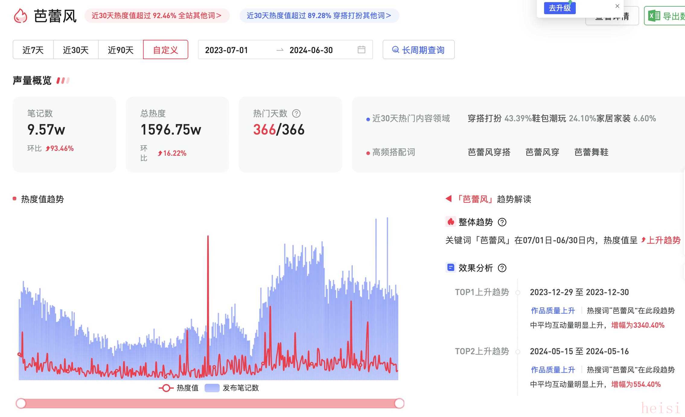 2023年初,韓國女團Blackpink成員Jennie在全球巡回演唱會上的造型帶火了芭蕾風(fēng)穿搭,其在社交媒體上的影響一直蔓延到2024年。巨量算數(shù)的統(tǒng)計數(shù)據(jù)顯示,“芭蕾鞋”這一關(guān)鍵詞在抖音的搜索熱度大約從2023年下半年開始活躍,2024年至今的搜索熱度也明顯高于去年同期。新紅平臺則顯示,在過去一年里,“芭蕾風(fēng)”在小紅書的熱度值和筆記數(shù)環(huán)比均有增長。