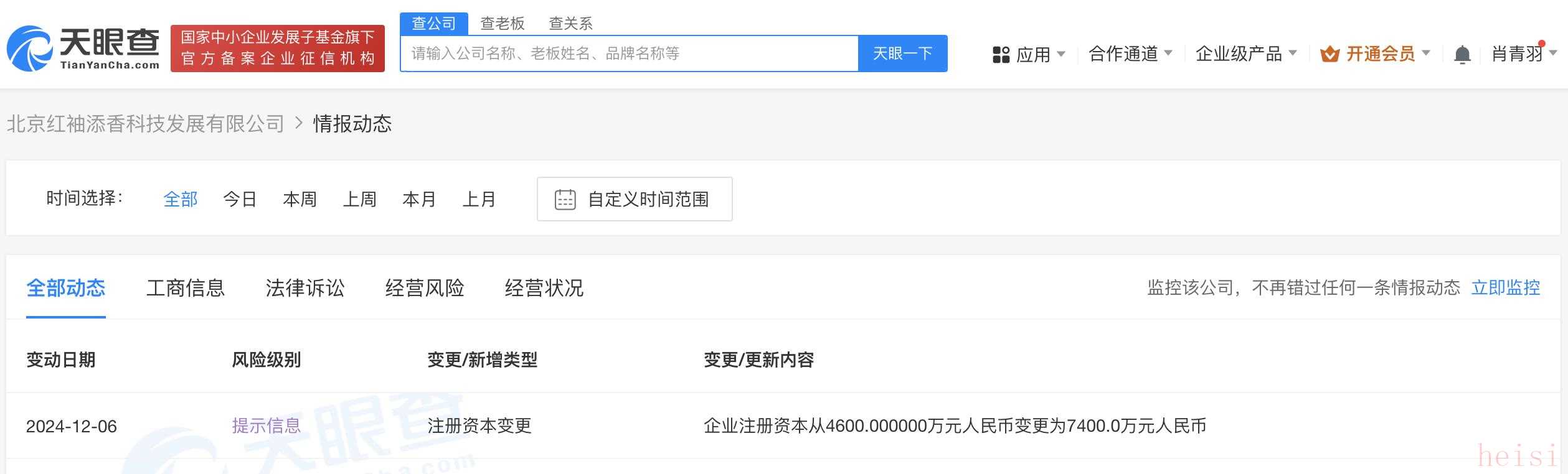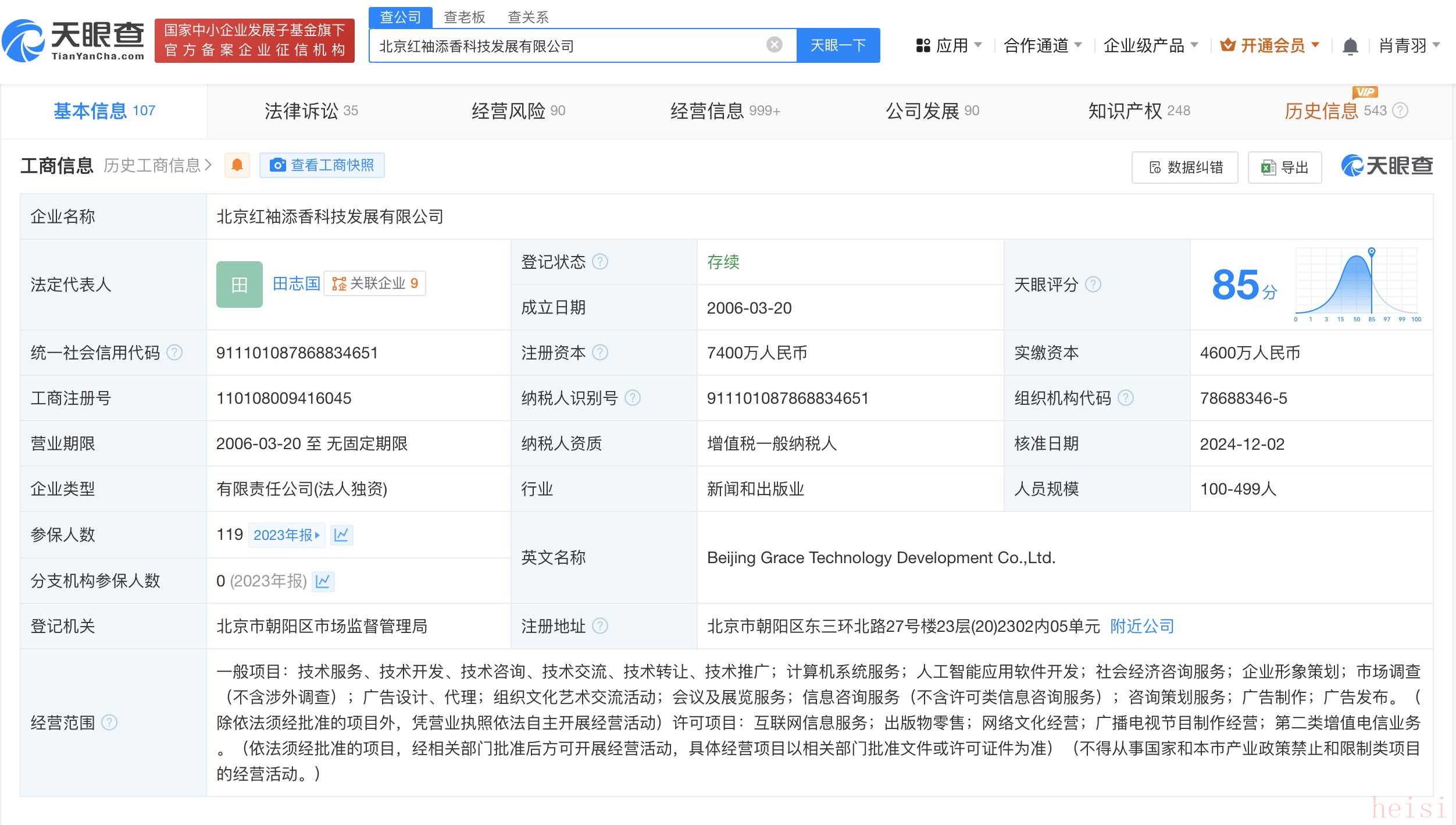 南方財經(jīng)12月6日電,天眼查App顯示,近日,北京紅袖添香科技發(fā)展有限公司發(fā)生工商變更,注冊資本由4600萬人民幣增至7400萬人民幣,增幅約60.87%。該公司成立于2006年3月,法定代表人為田志國,經(jīng)營范圍含互聯(lián)網(wǎng)信息服務(wù)、出版物零售、網(wǎng)絡(luò)文化經(jīng)營、廣播電視節(jié)目制作經(jīng)營等,由閱文集團(tuán)(HK.00772)全資持股。公開信息顯示,紅袖添香品牌隸屬于閱文集團(tuán),是知名女性文學(xué)數(shù)字版權(quán)運(yùn)營商。