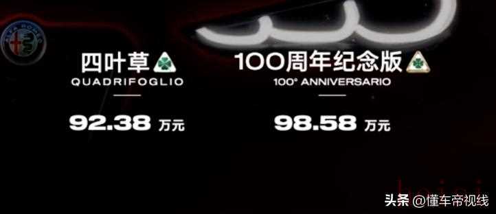由于2023年正值阿爾法·羅密歐四葉草系列誕生100周年,因此阿爾法·羅密歐基于新款Giulia高性能四葉草車型推出100周年紀(jì)念版,該車全球限量100輛,中國市場配額為5輛。與普通版新款Giulia四葉草相比,該車可提供專屬車身顏色、Akrapovi?(天蝎)排氣系統(tǒng)、車內(nèi)金色縫線、中控臺(tái)專屬徽章、碳纖維和Alcantara材質(zhì)方向盤等。