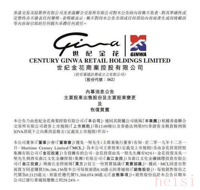 世紀(jì)金花公告顯示,公司董事會獲吳一堅(主席兼執(zhí)行董事)告知,于2019年12月1日,主要股東“MCL”、金花投資及吳一堅與曲江金控及曲江投資訂立一份買賣協(xié)議,據(jù)此,MCL擬向買方出售3.36億股公司每股面值0.10港元的普通股,每股銷售股份的代價為0.2123港元,相當(dāng)于總代價7136.81萬港元。銷售股份占于公告日期公司已發(fā)行普通股總數(shù)之約29.24%。
