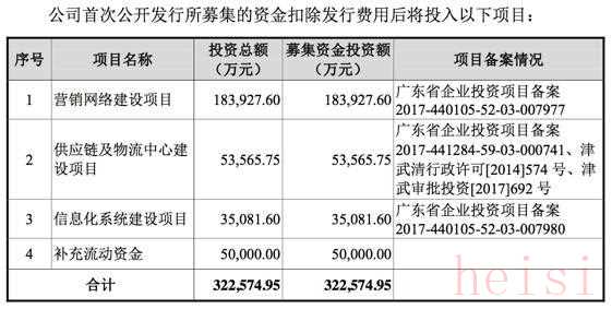 招股說(shuō)明書(shū)同時(shí)披露了此次募集資金的用途,擬首次公開(kāi)發(fā)行人民幣普通股 (A 股)不超過(guò)12700萬(wàn)股,其中18.39億元用于營(yíng)銷網(wǎng)絡(luò)建設(shè)項(xiàng)目,5.36億元用于供應(yīng)鏈及物流中心建設(shè)項(xiàng)目,剩下的為信息化系統(tǒng)建設(shè)和補(bǔ)充流動(dòng)資金。