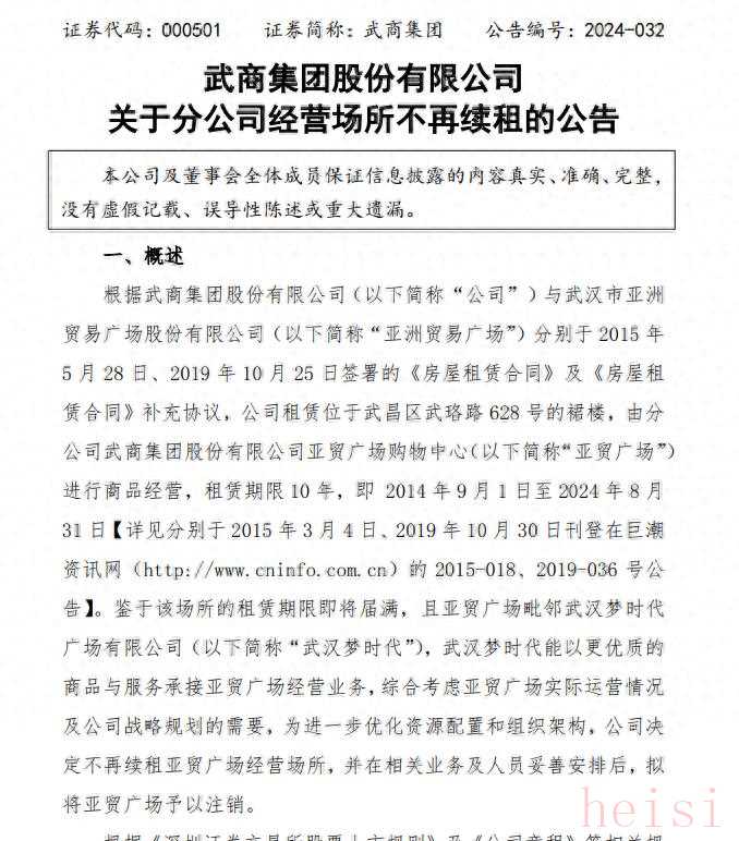 8月7日晚,武商集團(tuán)(000501.SZ)發(fā)布公告稱,決定不再續(xù)租分公司武商集團(tuán)股份有限公司亞貿(mào)廣場(chǎng)購(gòu)物中心(以下簡(jiǎn)稱“亞貿(mào)廣場(chǎng)”)經(jīng)營(yíng)場(chǎng)所,并在相關(guān)業(yè)務(wù)及人員妥善安排后,擬注銷亞貿(mào)廣場(chǎng)。