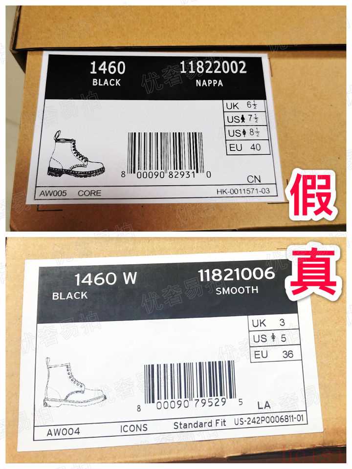 正品馬丁靴的鞋盒一側(cè)會貼一個白色的貼標(biāo),上面寫著鞋子的尺寸、款式、顏色。檢查盒中的馬丁靴的情況是否和貼標(biāo)上的內(nèi)容相符。貼標(biāo)上的序列號應(yīng)與盒中裝的靴子的內(nèi)側(cè)所印的序列號完全一致。序列號具有唯一性,如果是收購的真鞋盒,序列號往往是不一樣的。假鞋的序列號通常都是批量生產(chǎn)的,容易出現(xiàn)與盒外標(biāo)信息不符的情況。