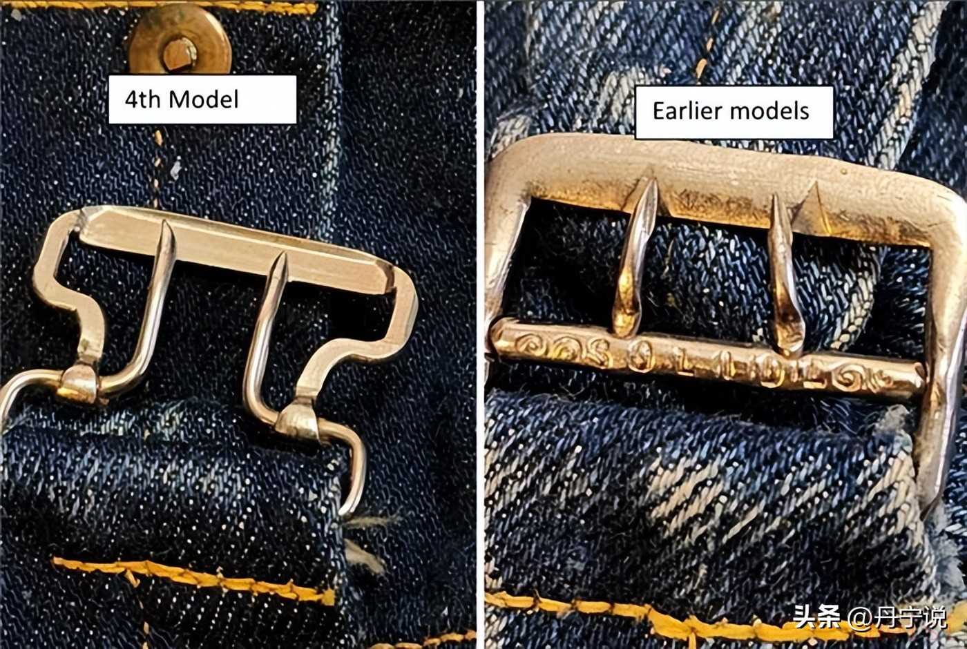 變化:取消了背帶扣,后袋弧形縫線改為直線縫線,拉鏈取代了紐扣門襟。
