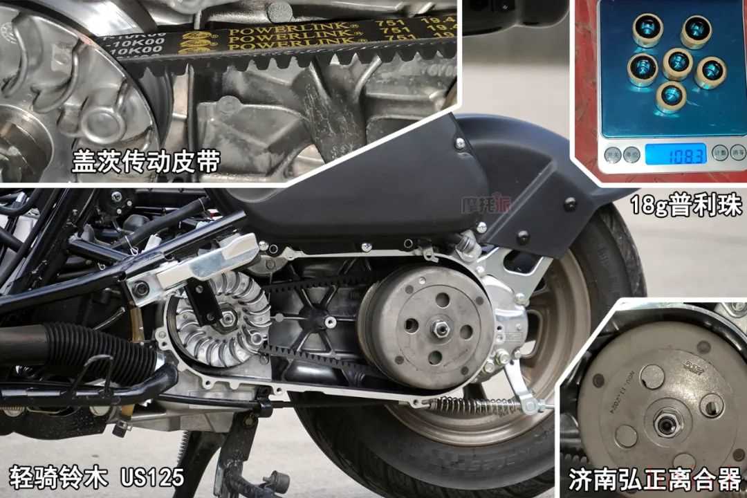 鈴木超級芯系列發(fā)動機的典型配置,沒有多少驚喜也沒有意外,傳動箱進氣連接到車架主管,高位進氣口仍然位于車頭的方向管柱側(cè)面。皮帶盤和離合器都來自濟南弘正,傳動皮帶為Gates蓋茨品牌,18g的普利珠重量與UY相比也沒有任何變化。