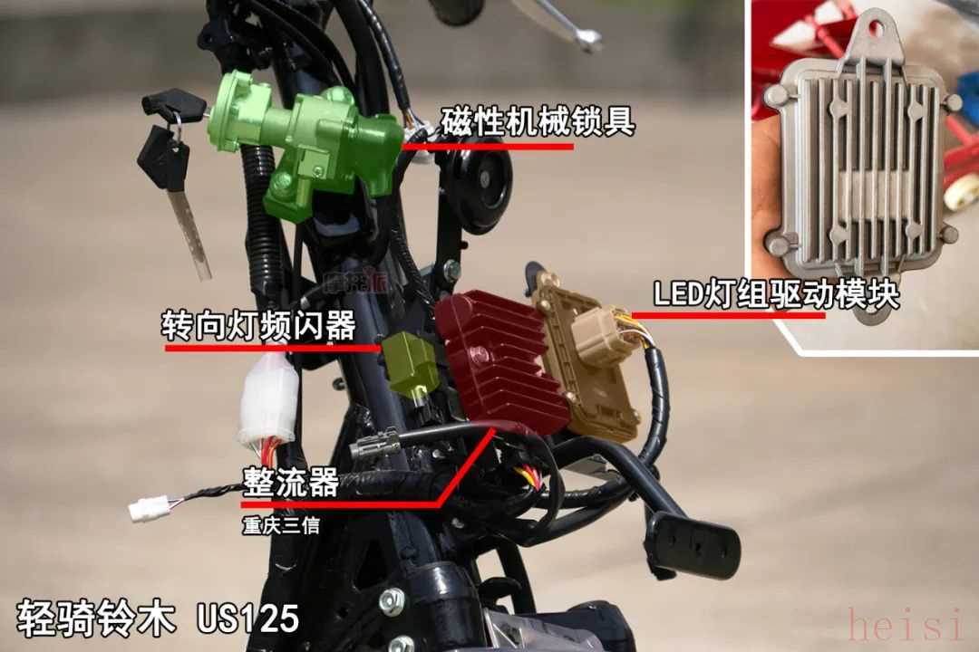 唯一看起來比UY先進一點的,就是頭燈LED模組的驅(qū)動器使用了分體式設(shè)計,接插件也大量使用了防水插頭。US125的儀表來自重慶三三,頭燈總成與UY相同仍然是江蘇葉迪提供,標(biāo)注近光功率為12W遠光功率24W。從功率上看,US125的頭燈與此前我們測試的大量車型相比并沒有特別突出,我們分析它取得優(yōu)勢的重點在于透鏡設(shè)計和分體式驅(qū)動,提供了更好的散熱能力。