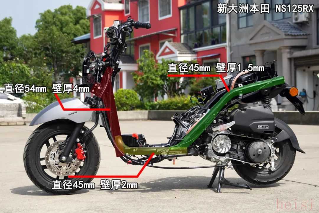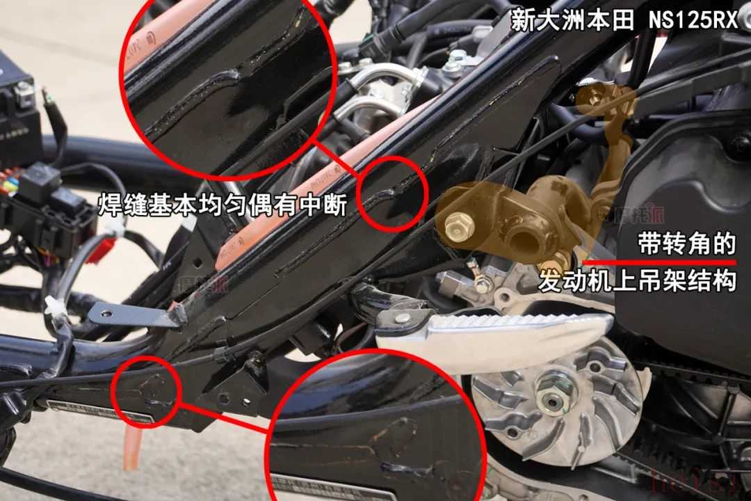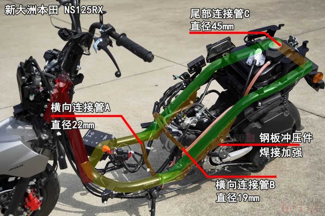 一眼看過去,NS125RX似乎與此前的本田系踏板一樣,延續(xù)了標(biāo)準(zhǔn)的雙梁車架設(shè)計,整體布局也沒有太多變化,但如果我們細致一些,就會發(fā)現(xiàn)它的車架主體,其實并不是由以前的前單立管+左右兩側(cè)的兩根縱梁組成,而是采用了直徑54mm、厚4mm的單前立管+直徑45mm、厚2mm的中段左右縱梁,再加上直徑45mm、厚1.5mm并帶有內(nèi)部焊接支撐結(jié)構(gòu)的尾部左右縱梁,三個部分通過鋼質(zhì)構(gòu)件焊接組成。