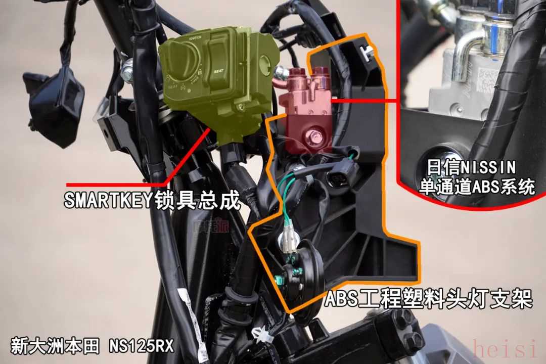 保險絲盒位于車身中部,繼電器來自日本京電KYODEN。來自日信的單通道ABS模塊布局在頭燈后方,ABS工程塑料制成的結(jié)構(gòu)件既起到固定ABS模塊的作用,又支撐了頭燈總成的安裝定位。