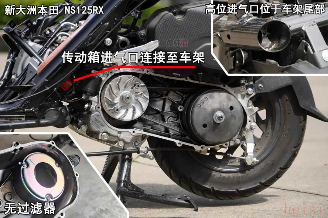 在傳動部分,NS125RX采用了高位進氣設(shè)計,傳動箱前部直接連接到車架左側(cè)縱梁上,但由于左側(cè)縱梁并不與鈴木U系列一樣連接到車頭前部,而是向后連接到車尾,所以它其實是從車尾的縱梁開口處進氣的,也是因為傳動箱這部分并沒有設(shè)計過濾器,所以NS125RX的縱梁尾部焊接了一處擋片來防止過大的物體從車尾滑落進入傳動箱。