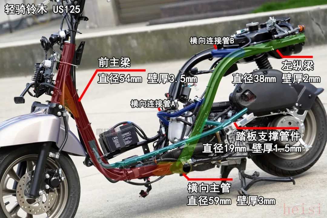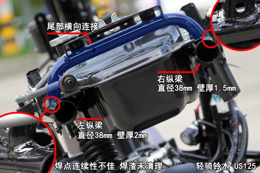 最重要的是,與此前我們測試的前后期兩款UY相比,US125的兩側(cè)縱梁直徑不變,仍為38mm,但右側(cè)縱梁壁厚由2mm修改為1.5mm,固定后減震器的左側(cè)縱梁仍為壁厚2mm。