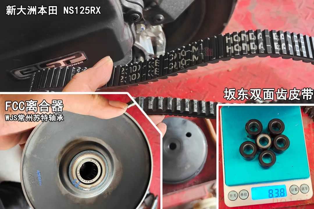NS125RX使用了來自坂東的雙面齒皮帶和FCC離合器,離合器組內(nèi)側(cè)軸承為常州蘇特WJS,14g普利珠重量是本田的傳統(tǒng)設(shè)定,相對較輕的普利珠能讓傳動皮帶推向外緣的時機更靠后段高轉(zhuǎn)速段,以獲得更充足的起步加速力道。相比鈴木系超級芯發(fā)動機,這臺eSP發(fā)動機的離合器側(cè)皮帶壓盤與傳動箱外殼的間隙尺寸明顯更小,設(shè)計更加緊湊。