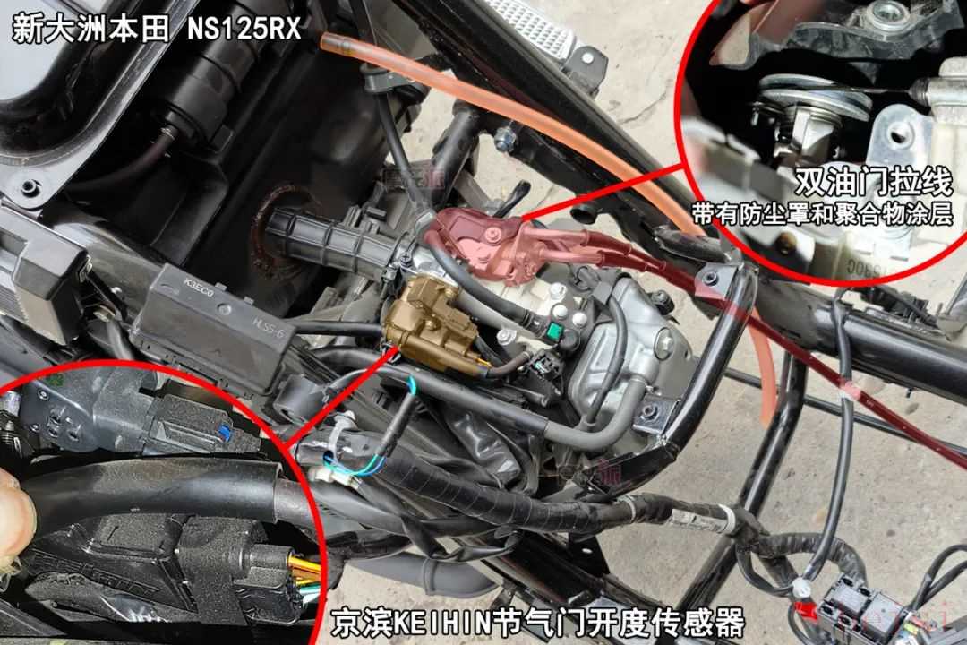 節(jié)氣門開度傳感器來自京濱KEIHIN,可以看到NS125RX雙油門拉線有聚合物涂層包裹,并是三車中唯一在這個部位設(shè)計防塵套的,必須給出好評。這一設(shè)計并不會增加多少成本,卻能長久的保持油門線的潤滑和手感。