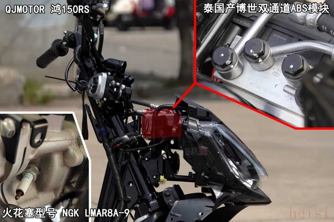 來到車頭部分,鴻150RS使用鋼管頭燈和ABS模塊固定支架,雙通道ABS與官方宣傳的一樣由博世BOSCH提供,模塊上激光刻印的Made in Thailand表示它并不是國產(chǎn)配件。