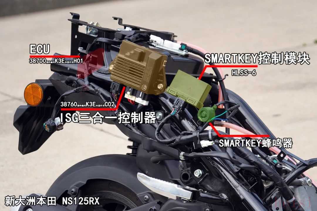 接下來,我們來看電氣部分。新本NS125RX的電噴系統(tǒng)來自鞏誠電裝,ECU布置于車尾中央,右側(cè)是同樣由鞏誠電裝提供的整合了脈沖啟動、自動啟停以及整流發(fā)電功能的ISG控制器(Integrated Starter Generator集成式啟動馬達/發(fā)電機,各品牌可能由于規(guī)避專利而命名不同),由控制器、蜂鳴器以及鎖具組成的SMARTKEY系統(tǒng)則是來自美蓓亞(原本田制鎖改名)。