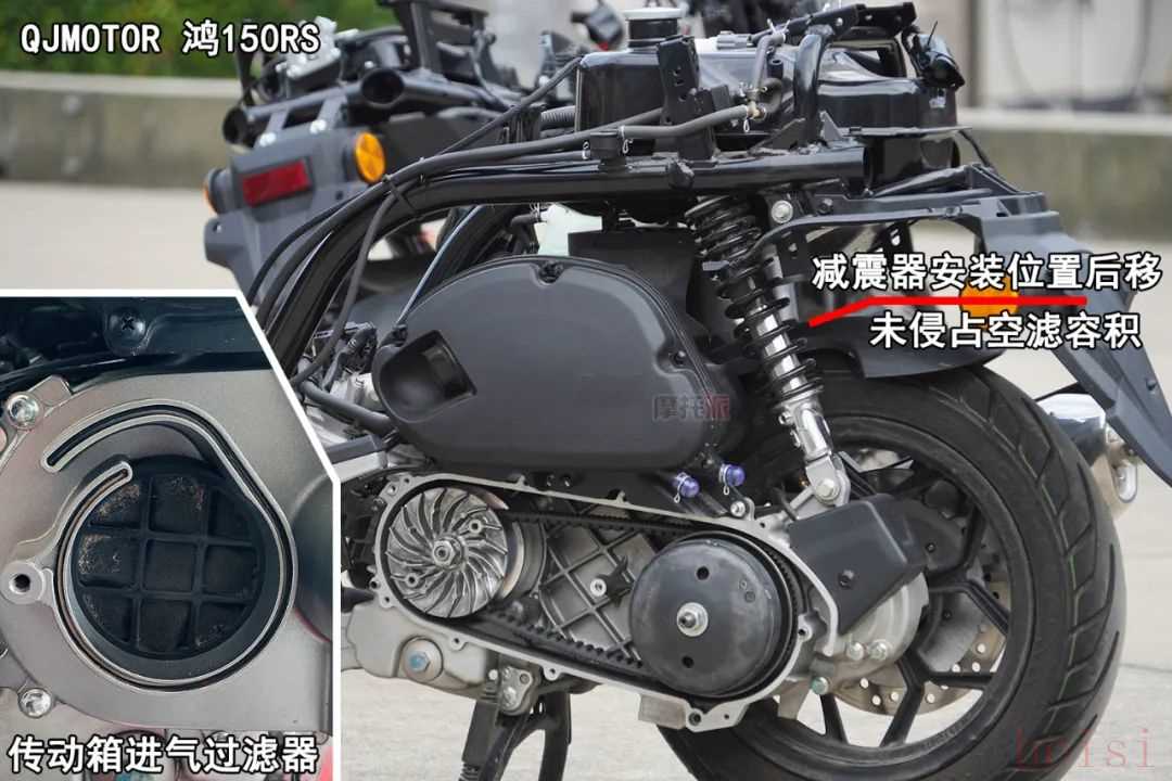 車架與鴻125和鈴木U系列車型的主要區(qū)別在于,鴻150RS的前單梁在踏板部分增加了長度,后減震的上端固定點也更靠近車尾,這兩處改動一個增加了更寬裕的踏板空間,另一個增加了空濾內(nèi)側(cè)的容積。以適應(yīng)鴻150RS更大的排量。
